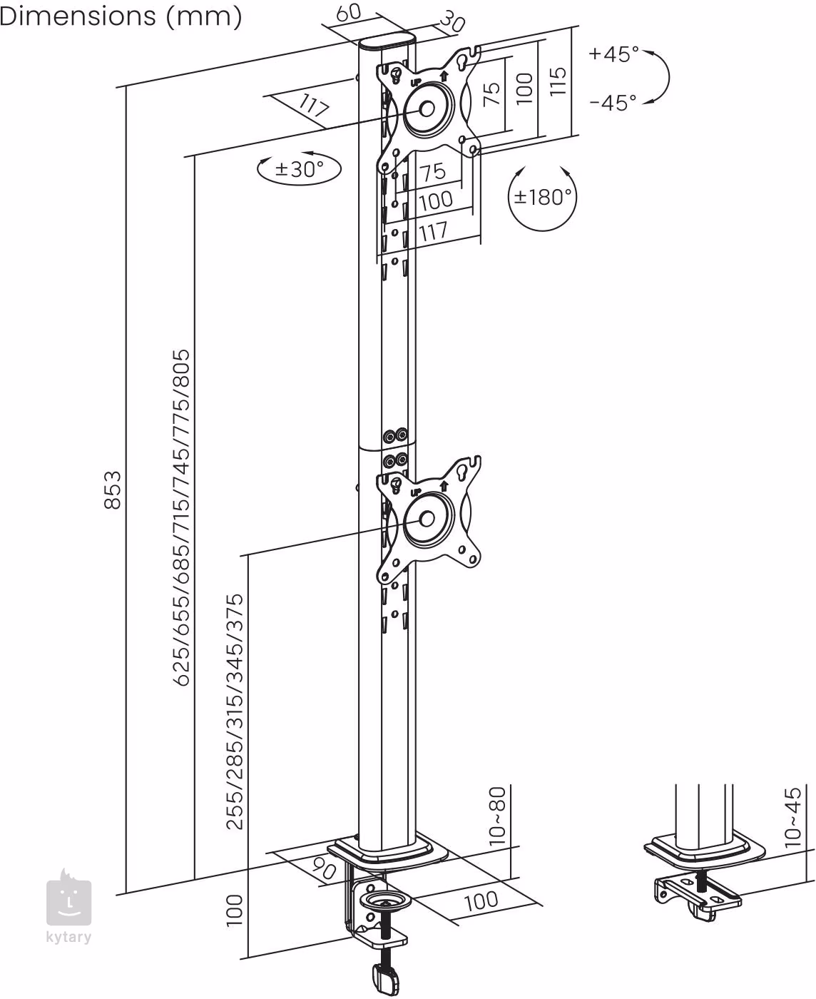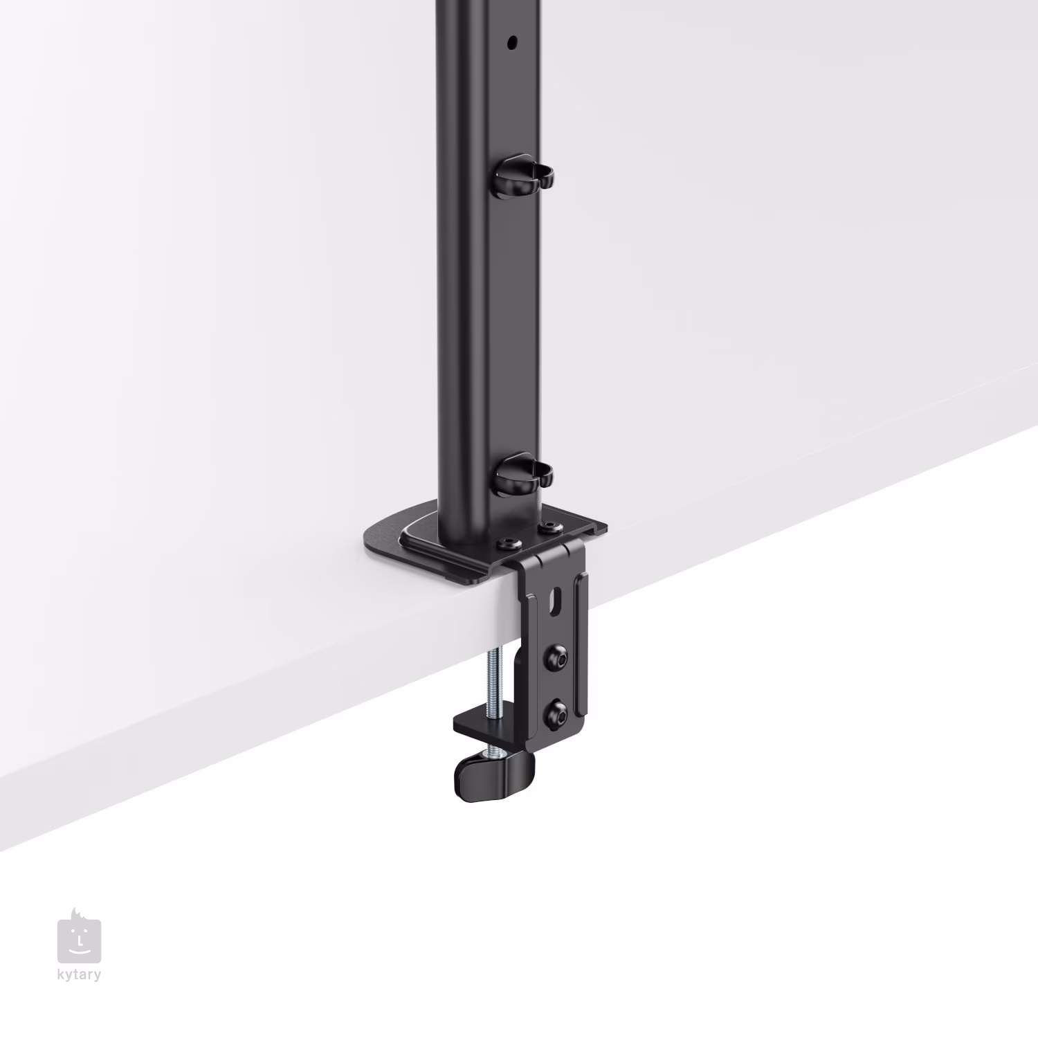 Uchwyt obsługuje monitory zgodne ze standardami VESA 75×75 i 100×100 i wytrzymuje obciążenie do 12 kg na każde ramię, w tym wyświetlacze zakrzywione. Oferuje szerokie możliwości regulacji – pochylenie od +45° do -45°, obrót na boki od +30° do -30° oraz obrót o 180° w celu uzyskania orientacji pionowej. Wysokość można regulować wzdłuż słupka o długości 843 mm i blokować za pomocą mechanizmu zabezpieczającego. Praktyczny jest również system bez użycia narzędzi, umożliwiający szybką regulację.