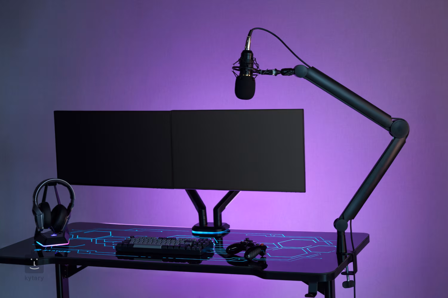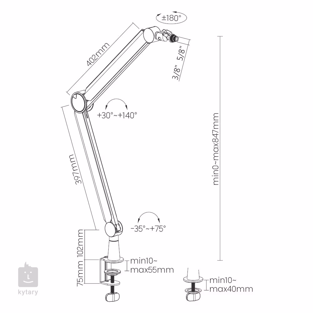 Ramię mikrofonowe z szeroką kompatybilnością, wbudowanym segregatorem na kable oraz możliwością obrotu ramienia o 360 stopni. Ramię można zamontować do krawędzi stołu o maksymalnej grubości deski 5,5 cm, jak również do otworu w desce. Materiał użyty stal, plastik i aluminium.