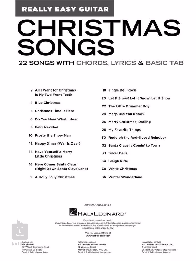 Publikacja Christmas Songs - Really Easy Guitar Series oferuje dwadzieścia dwa utwory o tematyce świątecznej i zimowej, które nawet początkujący gitarzysta może zagrać na gitarze. Utwory zawierają teksty, oznaczenia akordów i ilustrowane palcowanie każdego akordu.