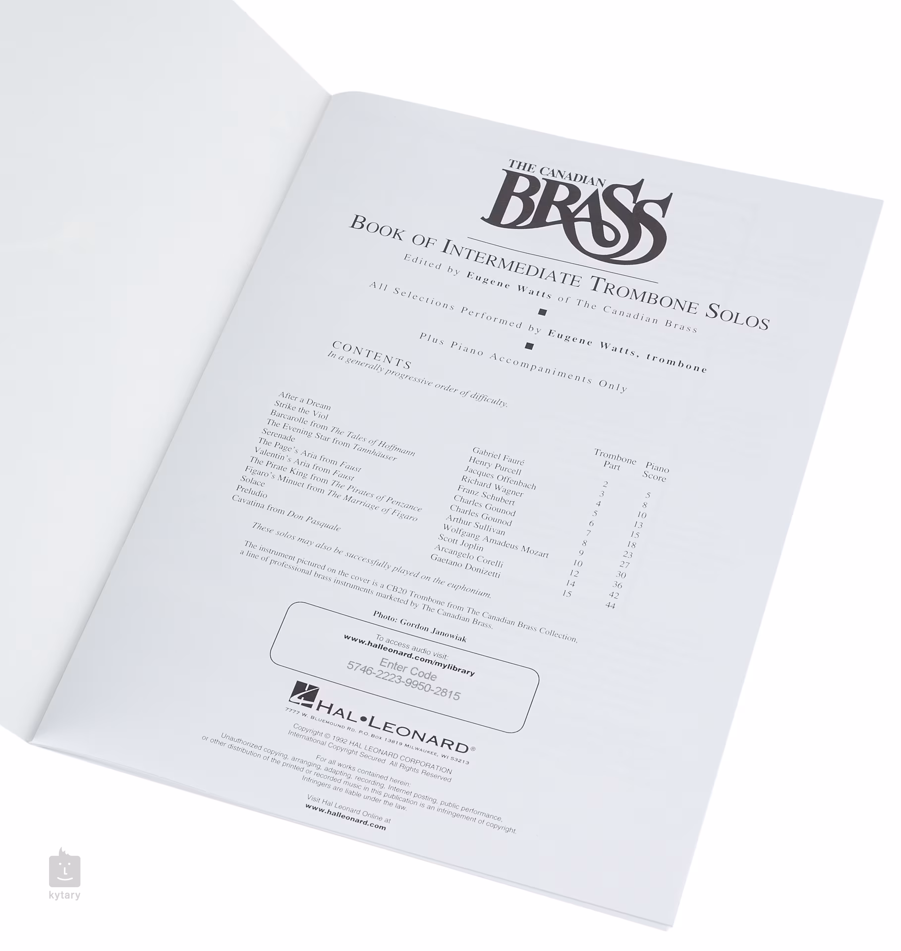 Canadian Brass Book of Intermediate Trombone Solos zawiera dwanaście utworów o średnim i zaawansowanym stopniu trudności na puzon solo z akompaniamentem fortepianu. Nagrania audio, tj. partie solowe nagrane przez puzonistę Eugene Wattsa oraz akompaniamenty fortepianowe, można pobrać lub przesłać online za pomocą unikalnego kodu zawartego w książce. Wielofunkcyjny odtwarzacz audio PLAYBACK+ umożliwia spowolnienie nagrań bez zmiany strojenia, ustawienie sekcji odtwarzania/pętli lub zmianę strojenia.