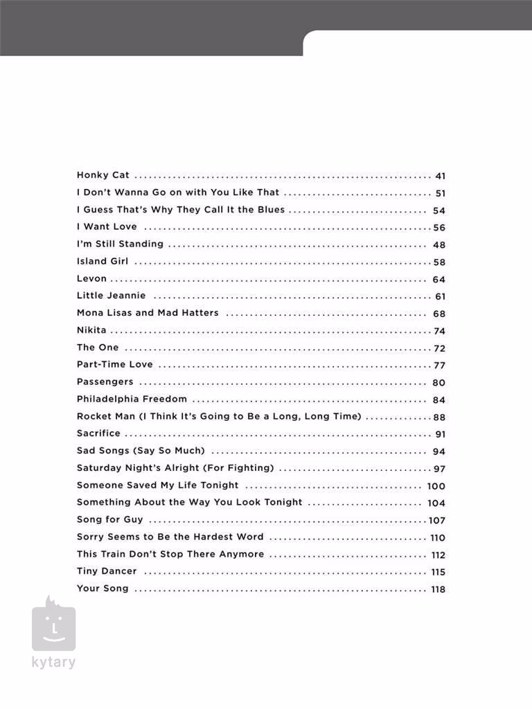 1. Are You Ready For Love [Elton John] 2. Believe [Elton John] 3. Bennie and the Jets [Elton John] 4. Blue Eyes [Elton John] 5. Border Song [Elton John] 6. Can You Feel the Love Tonight [Elton John] 7. Candle in the Wind [Elton John] 8. Circle of Life [Elton John] 9. Crocodile rock [Elton John] 10. Daniel [Elton John] 11. Don't Go Breaking My Heart [Elton John] 12. Don't Let the Sun Go Down on Me [Elton John] 13. Electricity [Elton John] 14. Goodbye Yellow Brick Road [Elton John] 15. Honky Cat [Elton John] 16. Home Again [Elton John] 17. I'm Still Standing [Elton John] 18. I Don't Wanna Go On With You Like That [Elton John] 19. I Guess That's Why They Call It the Blues [Elton John] 20. I Want Love [Elton John] 21. Island Girl [Elton John] 22. Little Jeanie [Elton John] 23. Levon [Elton John] 24. Mona Lisas and Mad Hatters [Elton John] 25. The One [Elton John] 26. Nikita [Elton John] 27. Part-time Love [Elton John] 28. Passengers [Elton John] 29. Philadelphia Freedom [Elton John] 30. Rocket Man (I Think It's Going to Be A Long, Long Time) [Elton John] 31. Sacrifice [Elton John] 32. Sad Songs (Say So Much) [Elton John] 33. Saturday Night's Alright (For Fighting) [Elton John] 34. Someone Saved My Life Tonight [Elton John] 35. Something About the Way You Look Tonight [Elton John] 36. Song for Guy [Elton John] 37. Sorry Seems to Be the Hardest Word [Elton John] 38. This Train Don't Stop There Anymore [Elton John] 39. Tiny Dancer [Elton John] 40. Your Song [Elton John]