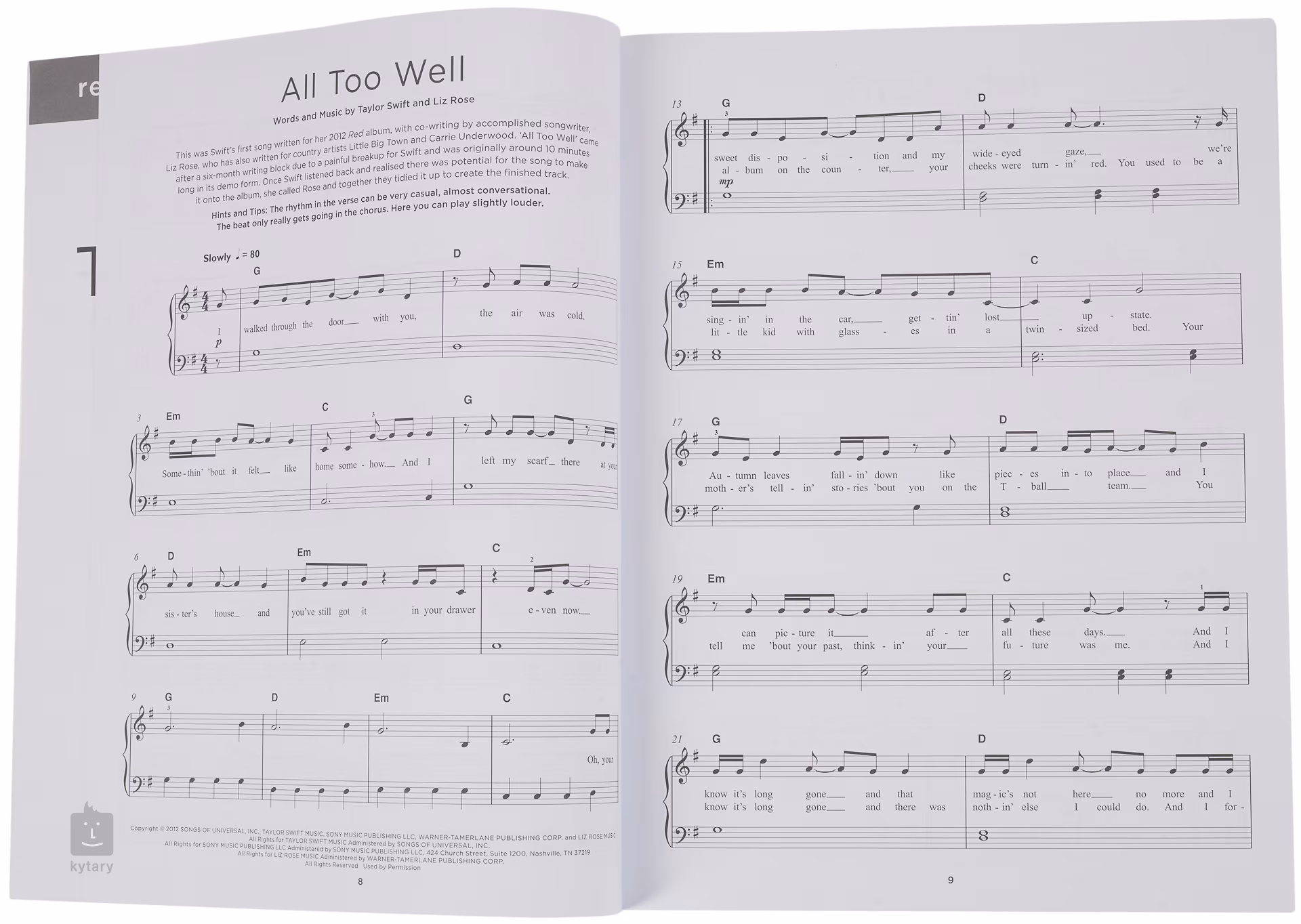 REALLY EASY PIANO: 40 TAYLOR SWIFT SONGS zawiera najpopularniejsze przeboje amerykańskiej piosenkarki Taylor Swift w prostych aranżacjach na fortepian, wraz z nutami i pomocnymi wskazówkami dotyczącymi wykonania każdego utworu.