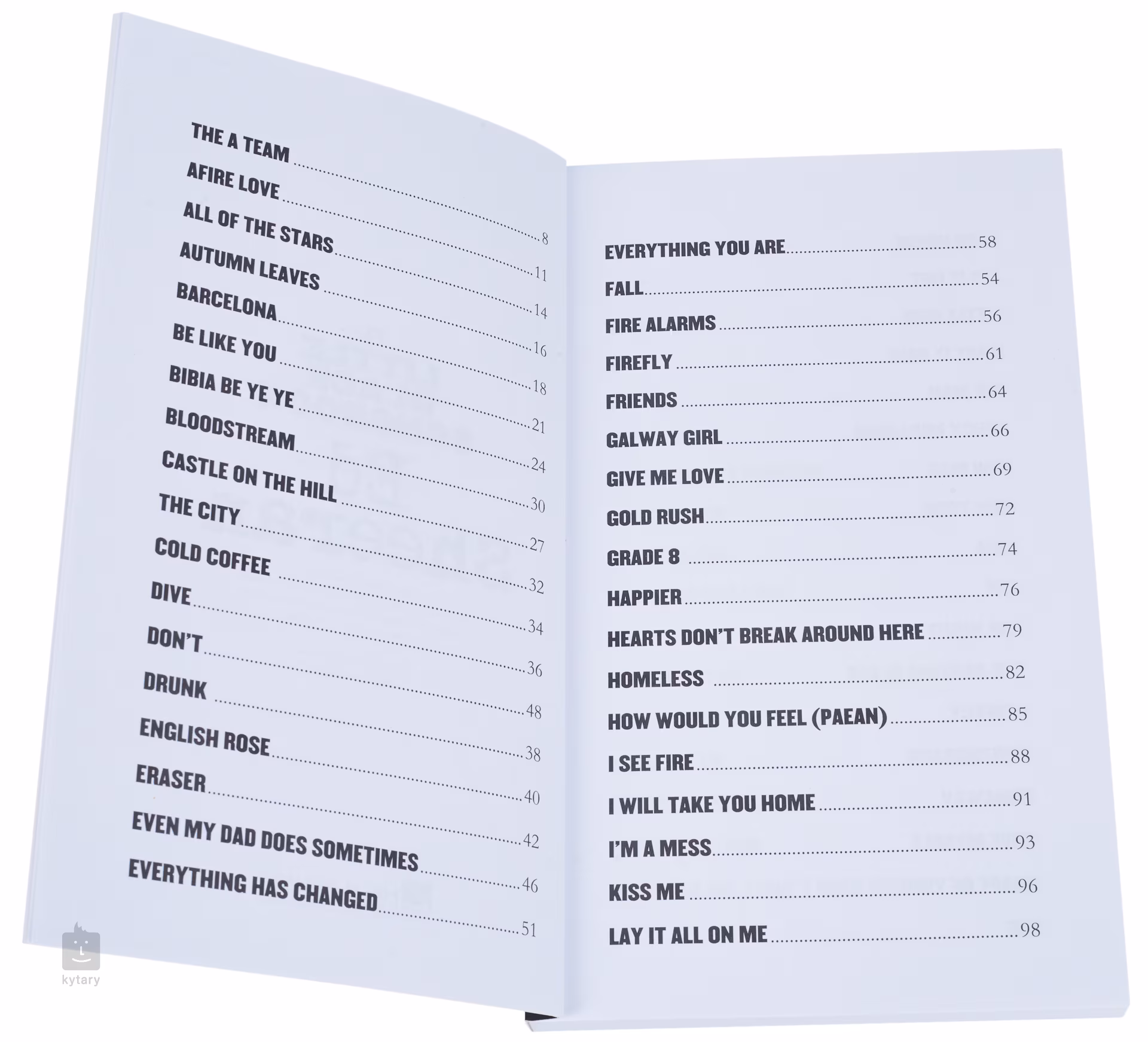 Zawartość piosenki: The A Team Afire Love All Of The Stars Autumn Leaves Barcelona Be Like You Bibia Be Ye Ye Ye Bloodstream Castle On The Hill Miasto Zimna kawa Nurkowanie Nie Pijany English Rose Gumka Nawet mój tata czasami to robi Wszystko się zmieniło Wszystko czym jesteś Upadek Alarmy przeciwpożarowe Firefly Przyjaciele Galway Girl Give Me Love Gorączka złota Grade 8 Happier Hearts Don't Break Around Here Bezdomny Jak byś się czuł (pean) I See Fire Zabiorę cię do domu I'm A Mess Kiss Me Lay It All On Me Lego House Let It Out Little Bird Make It Rain The Man Nancy Mulligan New Man Nowy Jork Nina Jeden Jedna noc Szklanka rozstania Idealny Fotografia Ucieczka Save Myself Shape Of You Ona Shirtsleeves Sing Small Bump So Sofa Oparzenie słoneczne Kwiaty z supermarketu Take It Back Morze na Teneryfie Głośne myślenie To Touch And Go UNI Wake Me Up Co ja wiem? Gdzie wylądujemy You Need Me I Don't Need You