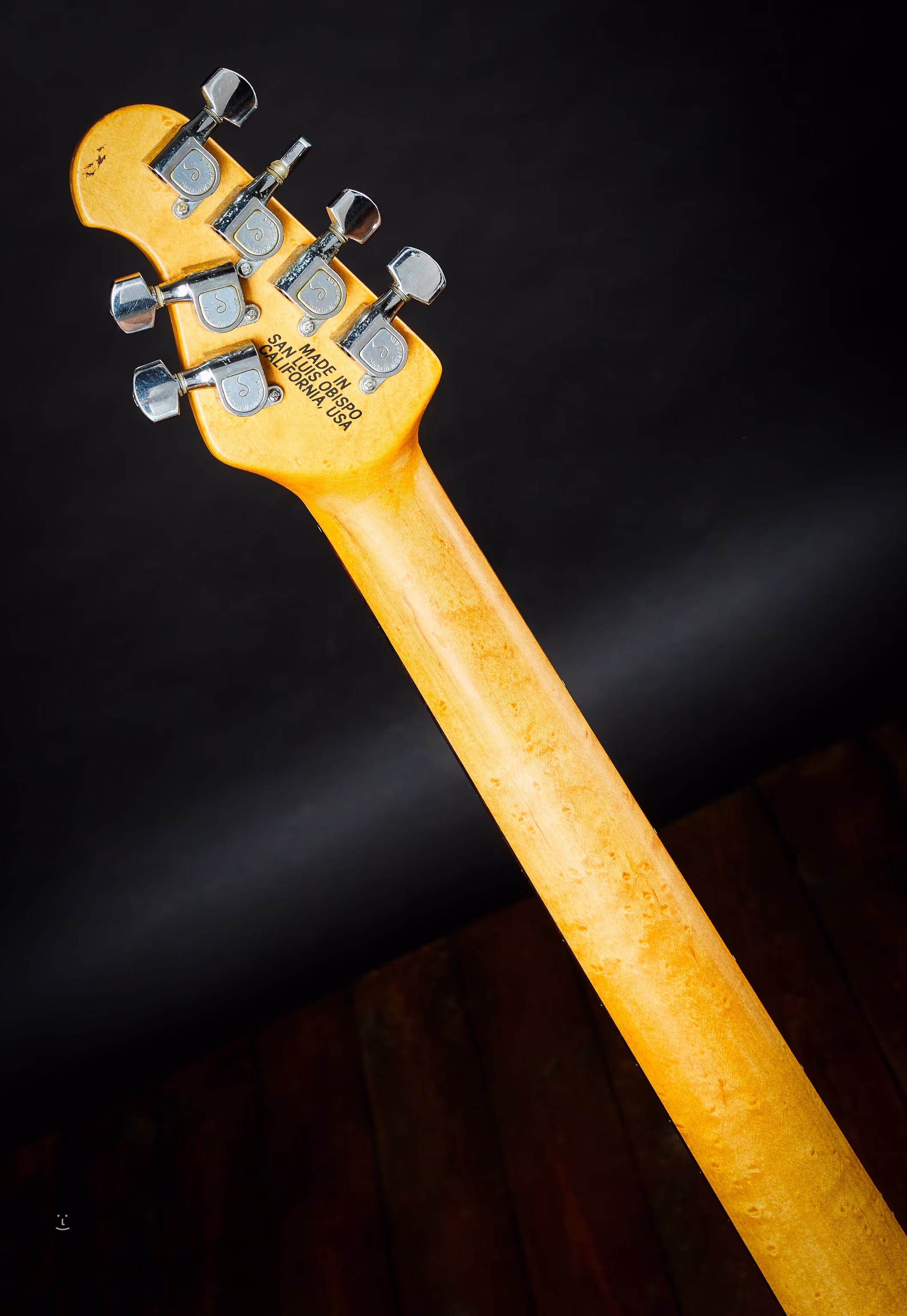 Oryginalne tremolo i blokady MusicMan, maszynki do strojenia Schaller. Przetworniki to humbuckery DiMarzio DP151 na główce, przetworniki z przodu i na szyjce nie są oznaczone, ale sądząc po lutowaniu są oryginalne (prawdopodobnie single wykonane przez DiMarzio dla Music Man na zamówienie).