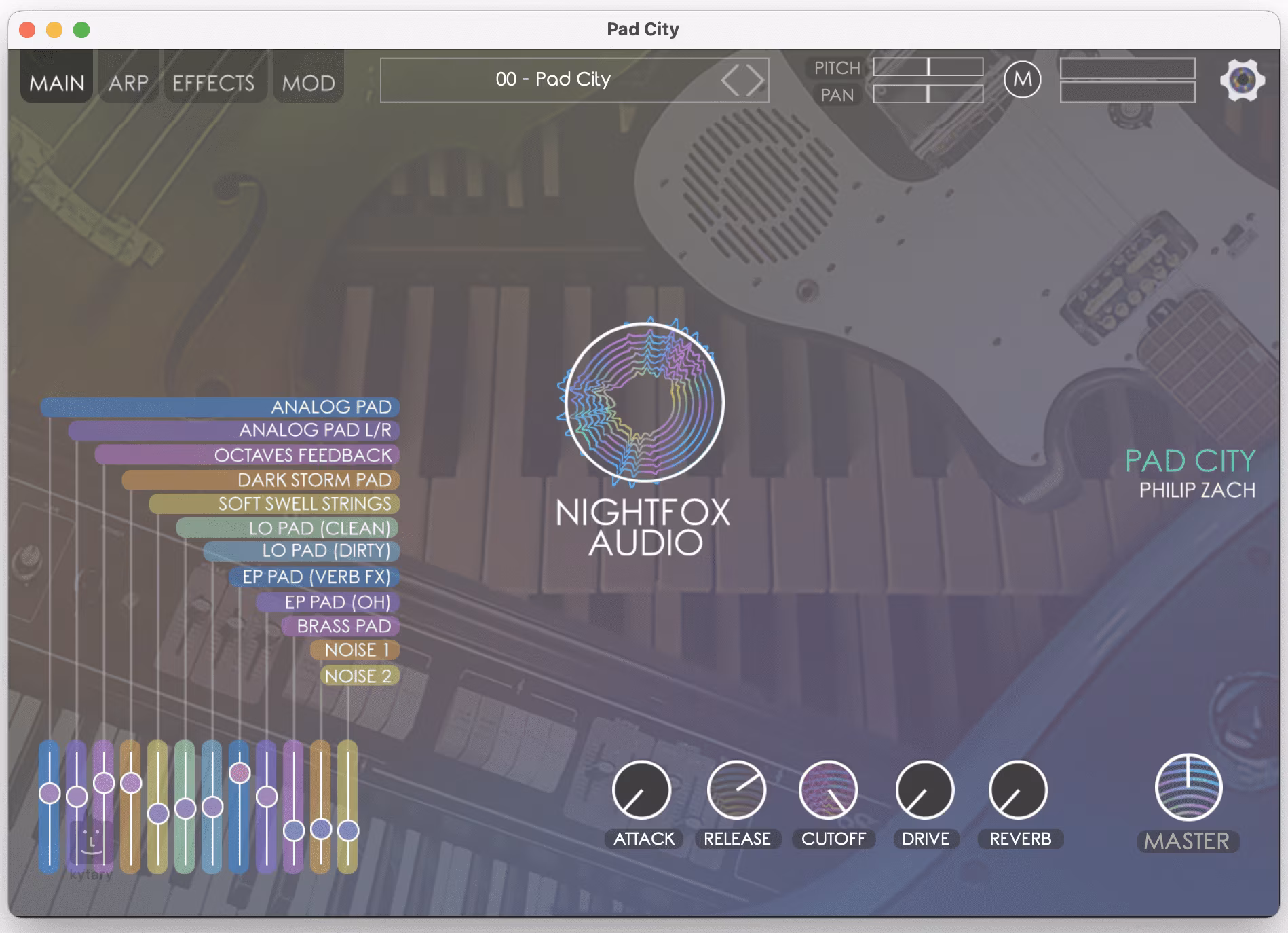 Nightfox Audio Pad City to wirtualny instrument składający się z 12 unikalnych padów. Sygnał każdego pada, począwszy od gitary, wiolonczeli, rogu, fortepianu akustycznego lub syntezatora, przechodzi przez pedały gitarowe i wzmacniacze oraz inne zewnętrzne przetwarzanie, aby dodać bogatą analogową teksturę do każdej partytury. Szczegółowo zsamplowany instrument zapewnia doskonałą jakość dźwięku i stanie się nieodzowną inspiracją podczas tworzenia muzyki.