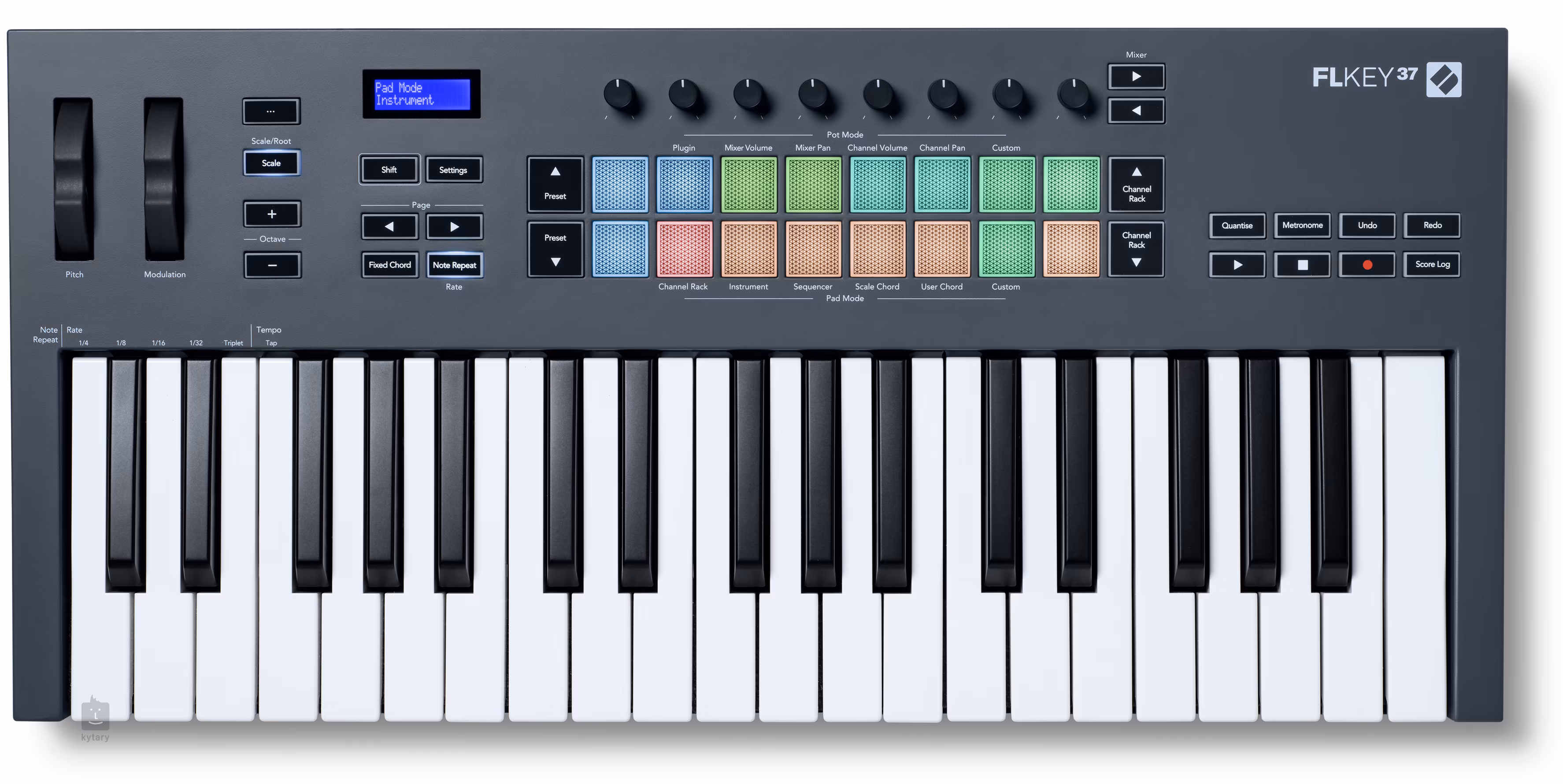 Klawisze Launchkey podbiły serca klientów przede wszystkim dzięki swoim kompaktowym rozmiarom, niewielkiej wadze, prostej konstrukcji i intuicyjnej obsłudze, i to samo dotyczy FLkey 37. Klawisze można więc zabrać ze sobą wszędzie i tworzyć lub nagrywać muzykę podczas długich podróży lub podczas relaksu na łonie natury. Pierwsza generacja posiada takie funkcje jak Arpeggiator, jednodźwiękowe wyzwalanie akordów z Fixed Chord Modes, nowe elementy sterujące do transportu lub miksowania, a także czułe na dotyk suwaki Pitch i Modulation. Tylny panel oferuje wyjście MIDI w postaci DIN-5pin dla dodatkowych syntezatorów, automatów perkusyjnych lub urządzeń MIDI, a także wyjście dla pedału Sustain dla jeszcze bardziej autentycznych wrażeń z gry.
