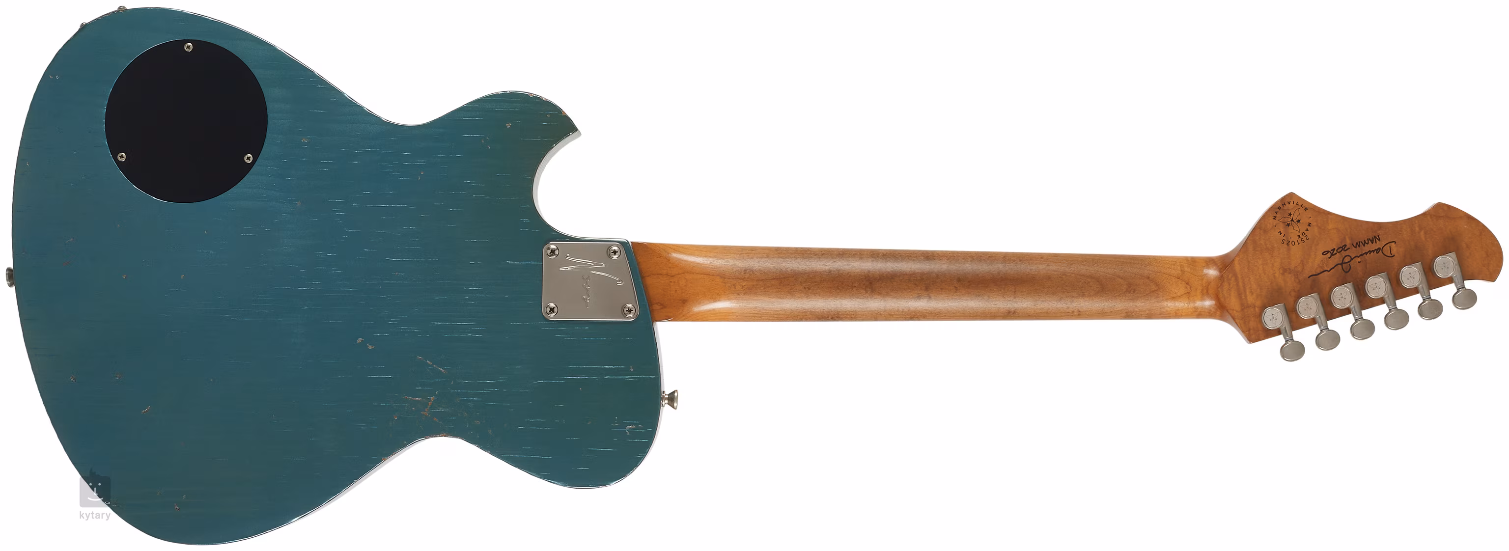 Lekki korpus gitary z wypalanej sosny o delikatnie asymetrycznym kształcie single-cut zdobi elegancki, rzeźbiony top (German Carve), wykończenie w kolorze Aged Pelham Blue, cienka warstwa lakieru nitrocelulozowego, subtelne postarzanie (light distress) oraz czarna płytka ochronna. Do klonowego gryfu o profilu Chunky C przyklejono palisandrową podstrunnicę z dwudziestoma dwoma progami z pakfongu/niklowo-srebrnego (.047″x.095″). Z vintage'owym wyglądem korpusu współgra również wygląd gryfu, który dzięki obróbce termicznej zyskał urok i charakter drewna dojrzałego przez lata. Kombinowany promień podstrunnicy gwarantuje wygodną grę akordów przy progu zerowym oraz komfortową grę i wyciąganie dźwięków w wyższych pozycjach podstrunnicy.