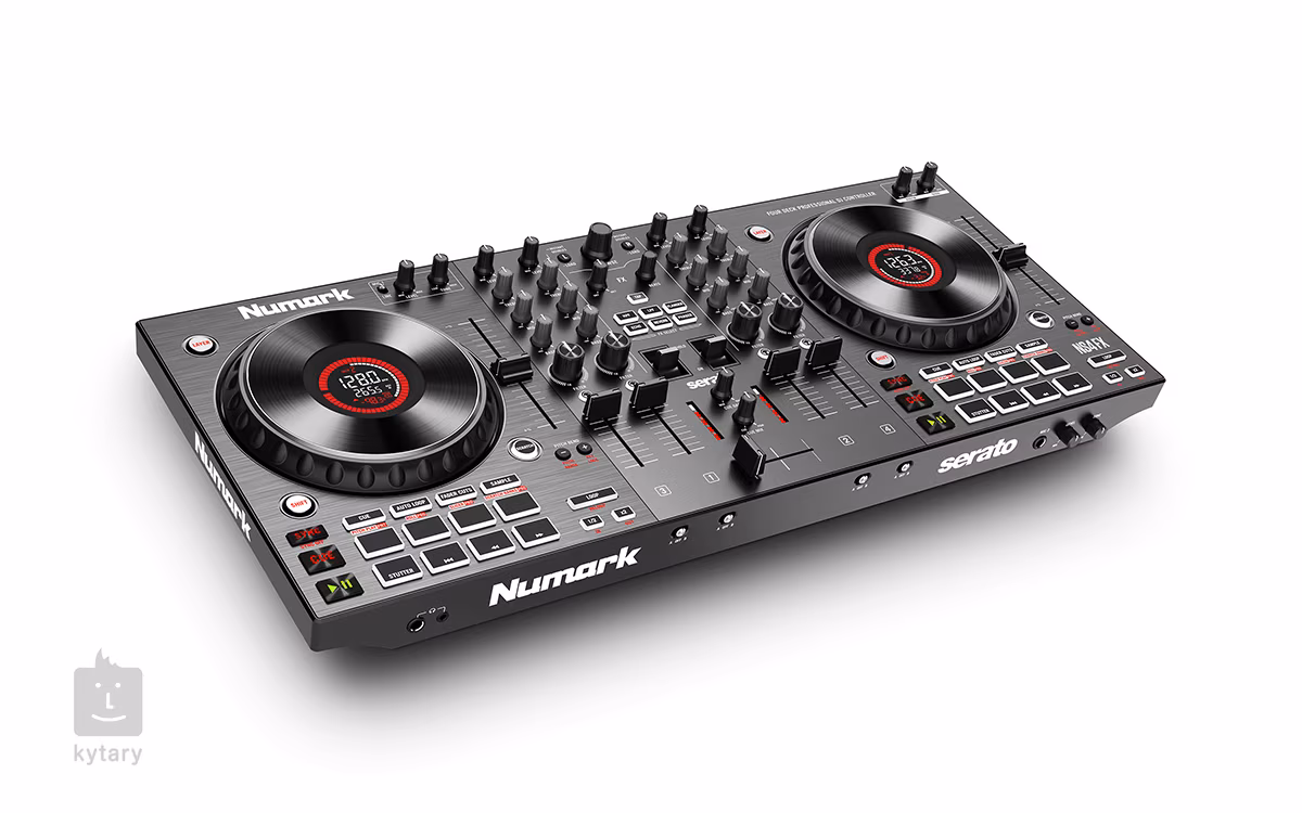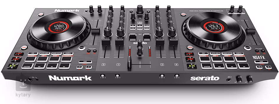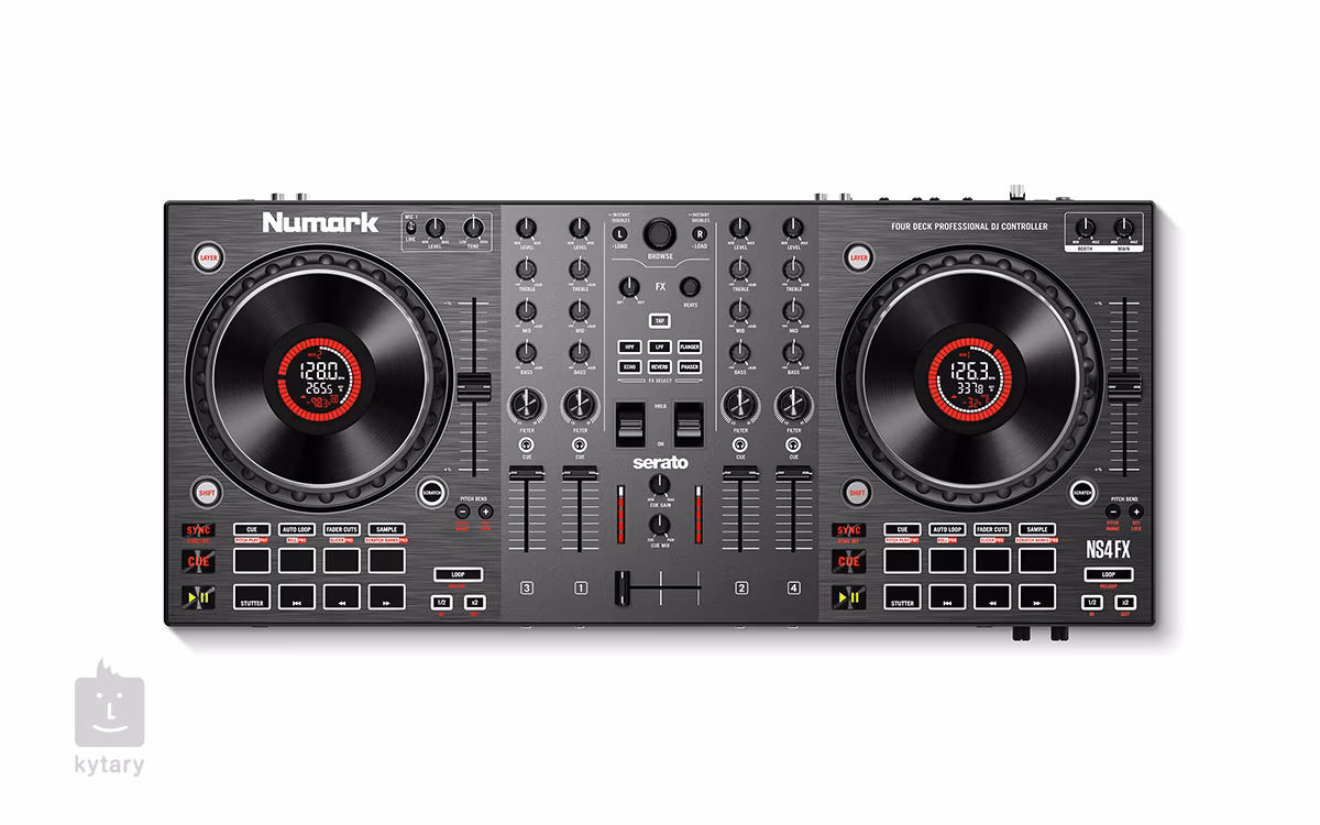 Numark NS4FX to czterokanałowy profesjonalny kontroler DJ ze zintegrowanymi wyświetlaczami w każdym z dwóch dużych 6" kół jog. Każdy kanał jest również wyposażony w duże pokrętło filtra do regulacji sygnału wejściowego, który można następnie dostosować za pomocą modułu FX z sześcioma przyciskami i pięcioma efektami lub trzypasmowego korektora. Następnie można przypisać każdemu kanałowi własny crossfader, zgodnie z potrzebami i preferencjami, lub użyć 8 podświetlanych padów do występów na żywo.