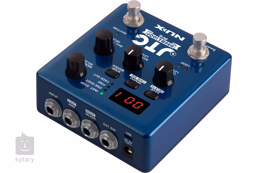 JTC Drum & Loop PRO (NDL-5) firmy Nux to zaawansowany looper i automat perkusyjny z prostym panelem sterowania, który mieści 6 godzin nagrywania i 256 gniazd pamięci do przechowywania pętli. Wszystkie podstawowe funkcje pętli (nagrywanie, odtwarzanie, overdub, cofanie, ponawianie, zatrzymywanie, czyszczenie) są obsługiwane przez prawy przełącznik nożny, podczas gdy lewy przełącznik nożny służy do sterowania sekcją rytmiczną pedału. Zintegrowany automat perkusyjny oferuje 40 schematów rytmicznych w różnych gatunkach (pop, rock, blues, metal i inne) oraz dwa oznaczenia tempa (4/4, 3/4). Naciśnij przełącznik nożny podczas odtwarzania danego schematu, aby dodać wypełnienie rytmiczne, które trwa do końca taktu.