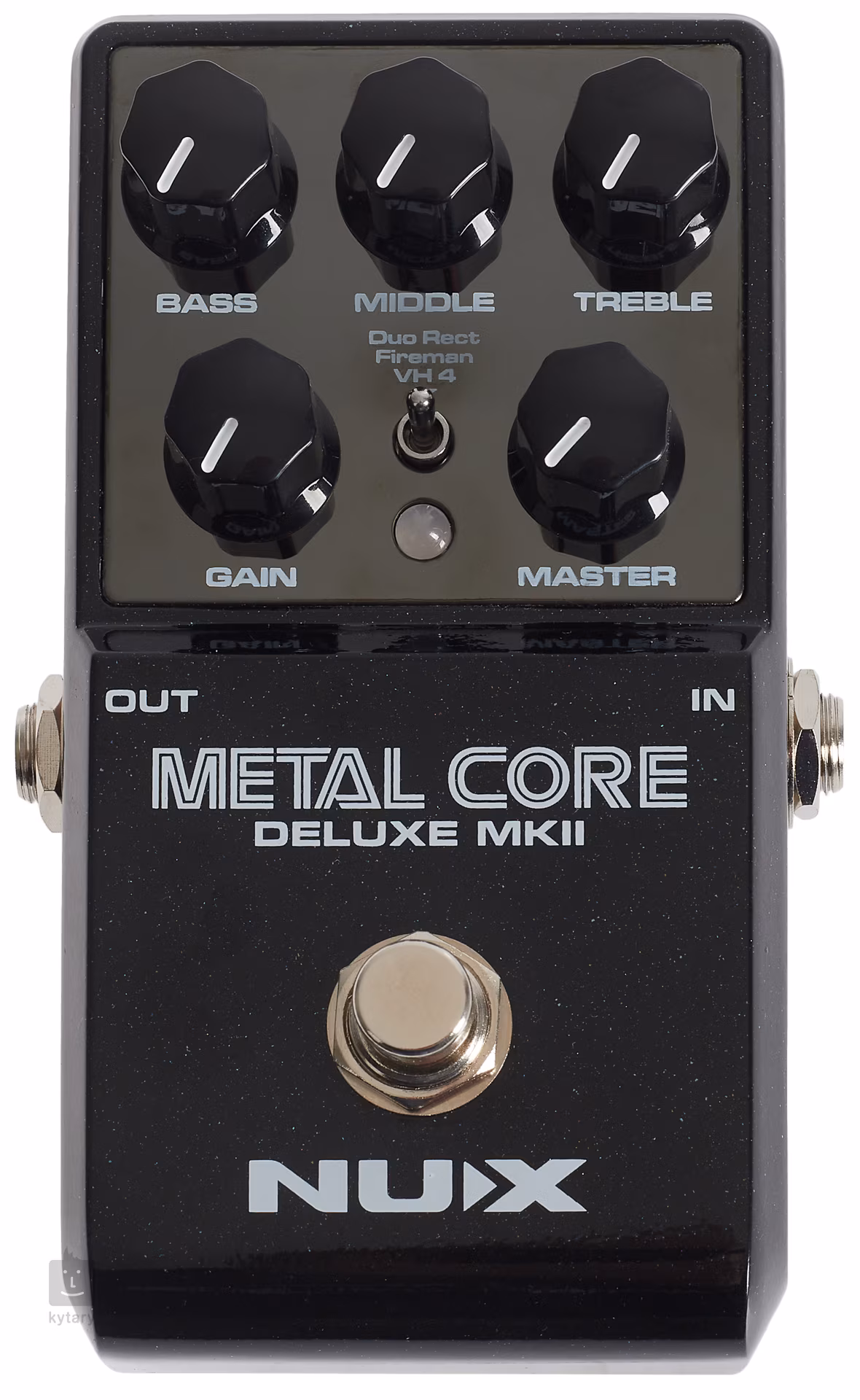 NUX METAL CORE DELUXE MKII to pedał przedwzmacniacza / zniekształcenia typu amp-in-a-box z trzema typami znanych wzmacniaczy gitarowych o wysokim wzmocnieniu, między którymi można się przełączać - Duo Rect oparty na brzmieniu Mesa Boogie Dual Rectifier, Fireman (Friedman BE-100) i VH4 oparty na charakterystyce czterokanałowego wzmacniacza Diezel.