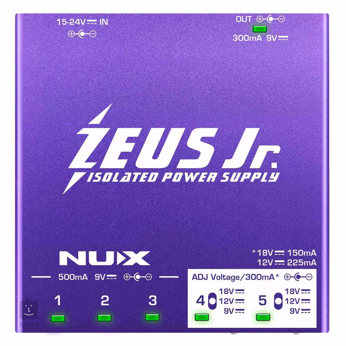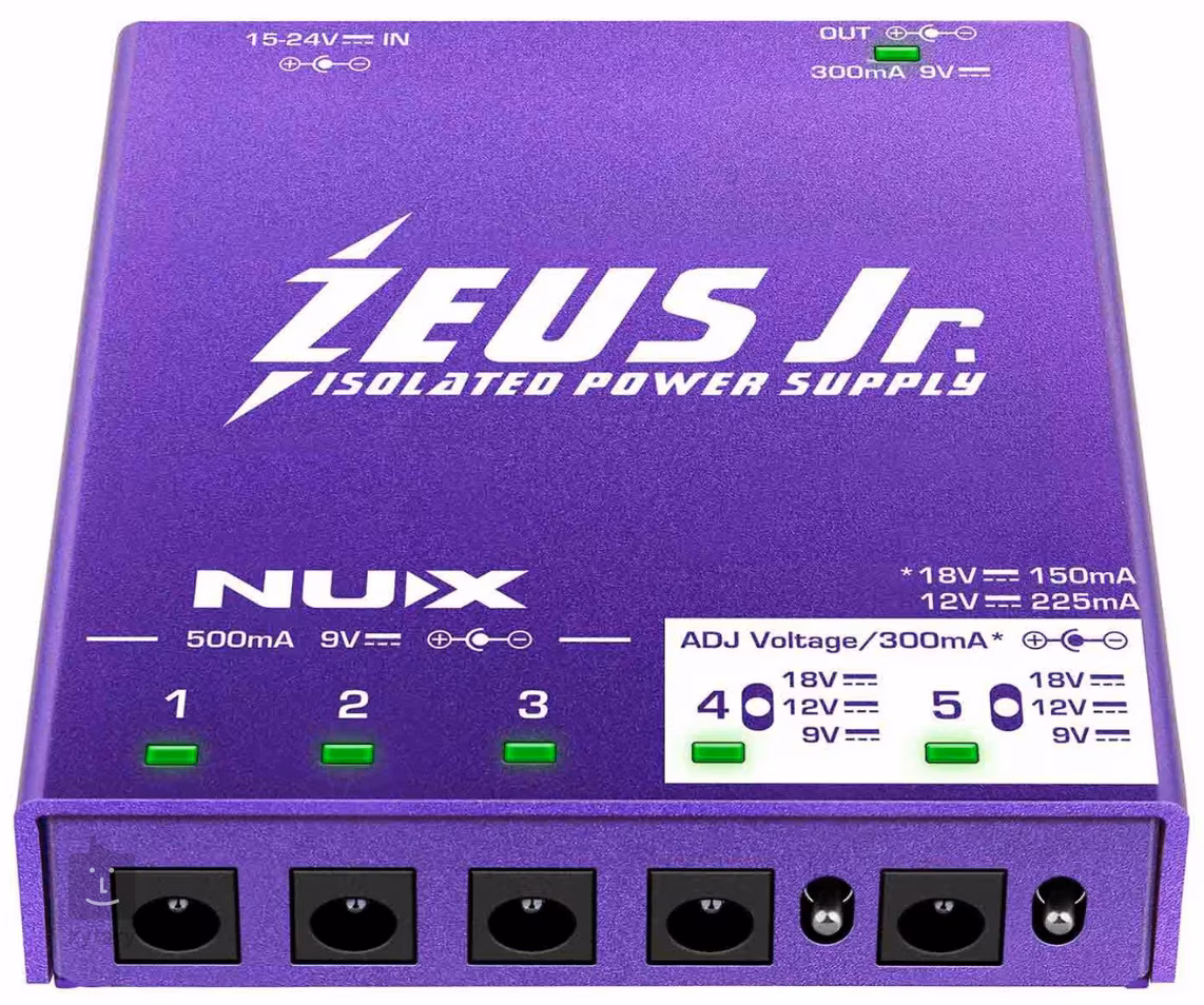 NIP-Z6 Zeus Jr to precyzyjnie zaprojektowany multi-adapter firmy NUX, który umożliwia jednoczesne zasilanie wielu efektów. Oferuje łącznie 6 izolowanych wyjść - cztery standardowe 9V (3x 500 mA, 1x 300 mA) i dwa przełączalne wyjścia pomiędzy 9V (300 mA), 12V (225 mA) i 18V (150 mA). W komplecie kable połączeniowe i przewód zasilający.