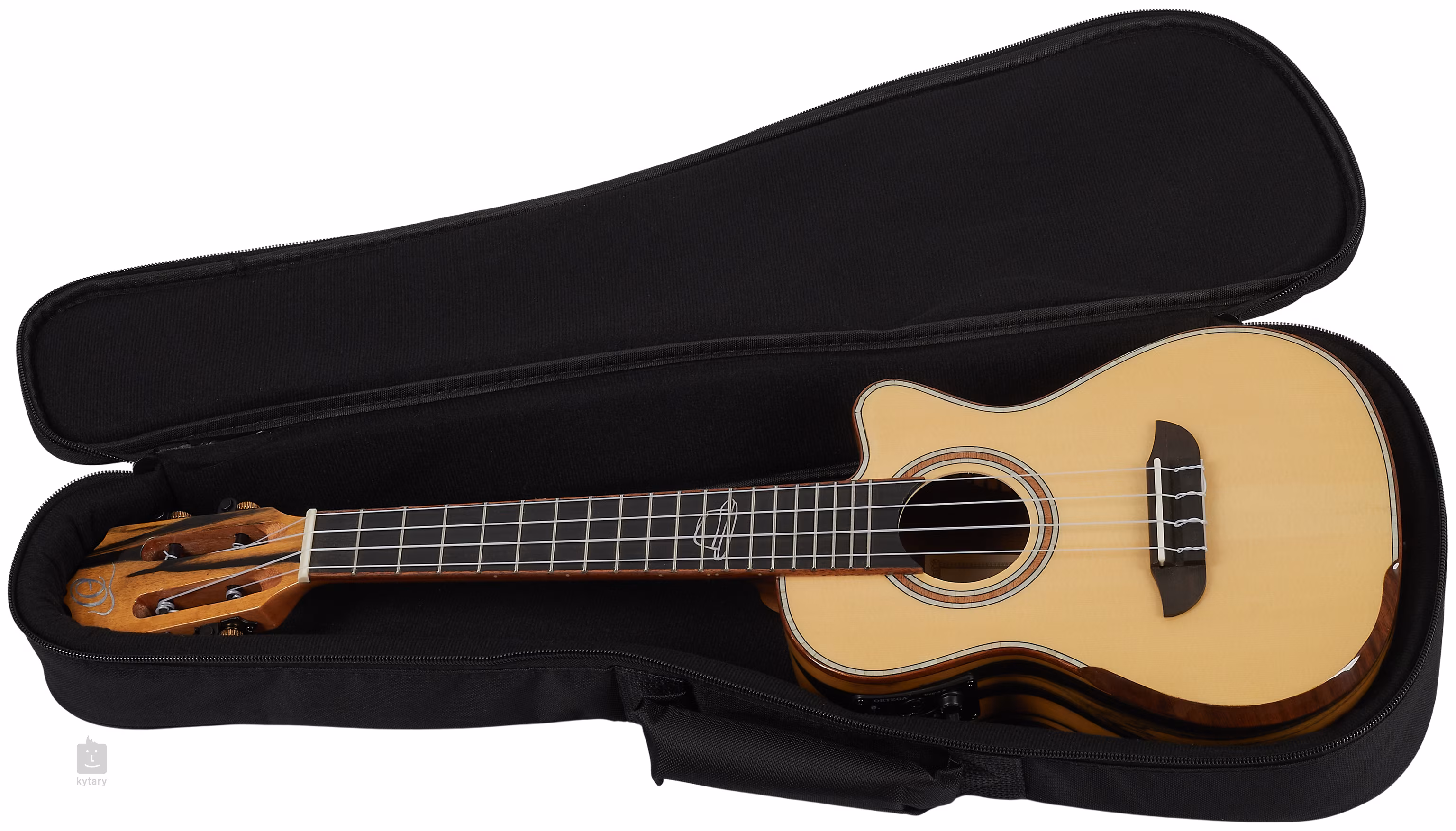 Przednia płyta ukulele jest wykonana z litego drewna świerkowego, tylna płyta i boki są wykonane z ręcznie dobranego warstwowego hebanu (Pale Moon Ebony). Ekskluzywny rysunek białego hebanu podkreśla lakier wypolerowany na wysoki połysk. Komfort gry podnosi ergonomiczna podpórka ramienia (armrest) z czarnego orzecha i dolne wycięcie korpusu.