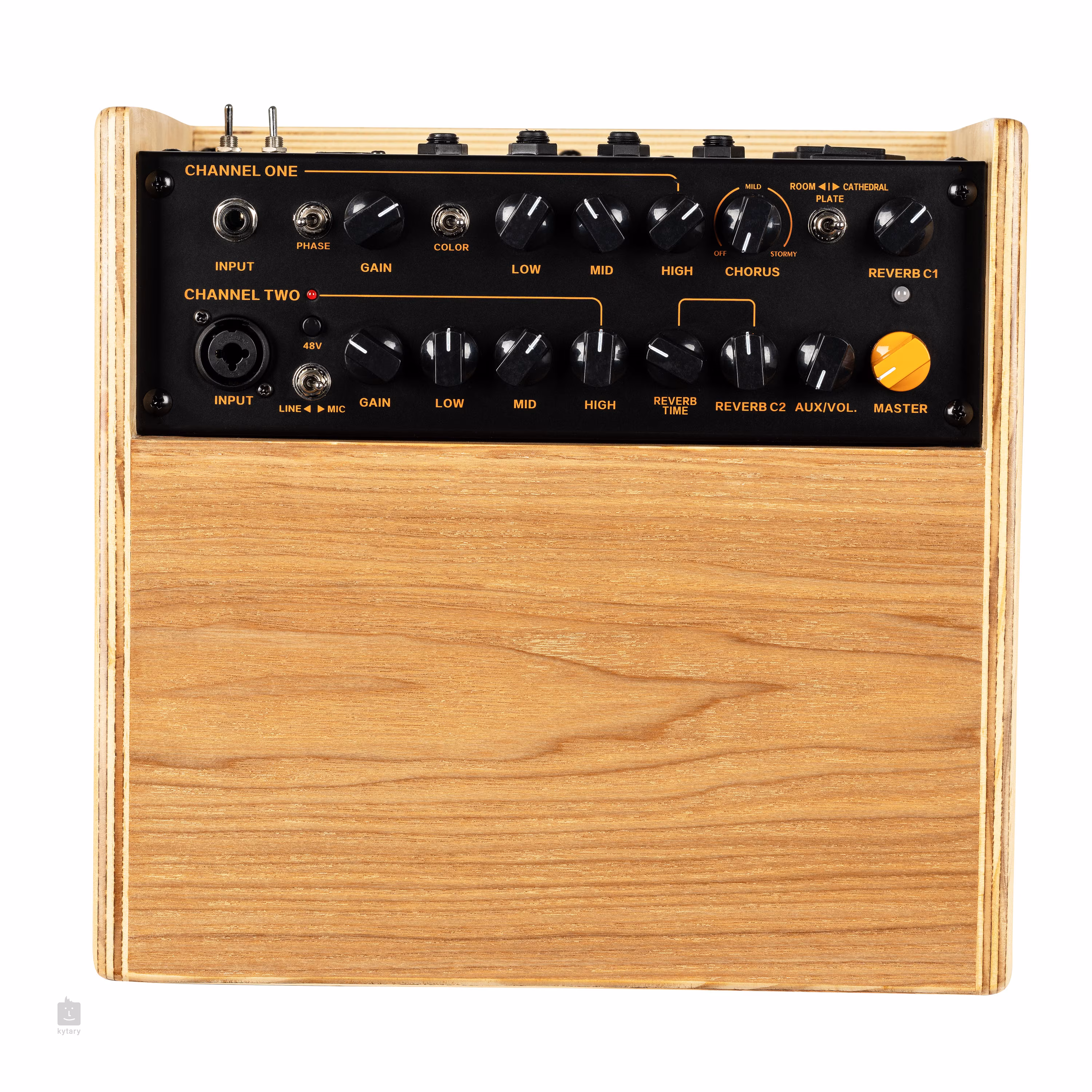 • Sterowanie 2x Gain, 2x Low, 2x Mid, 2x High, 1x Chorus, 2x Reverb, 1x Reverb Time, 1x AUX Volume, 1x Master, 1x Chorus Type, 1x Phase, 1x Color