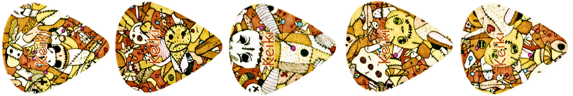 Seria stroików OrtegaKeiki już na pierwszy rzut oka zachwyca ciekawym designem z kolorową grafiką. Wykonane są z wysokiej jakości materiału celuloidowego, co zapewnia im wyjątkową elastyczność i wyraźny, mocny atak. W zestawie znajdziemy pięć kostek o grubości 0,71 mm. Idealny wybór dla początkujących i zaawansowanych graczy.