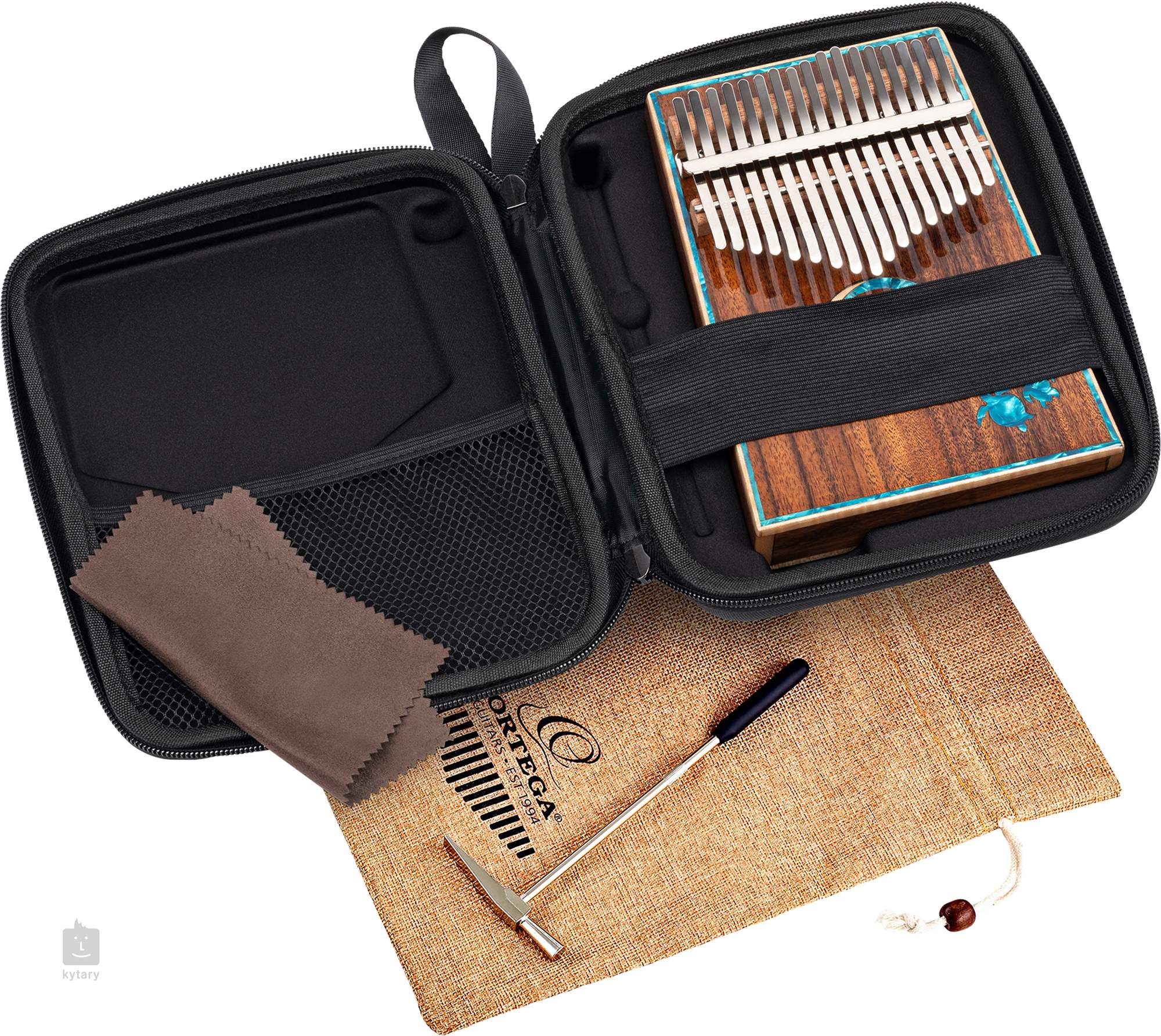 Kalimba OKB30TH świętuje 30-lecie popularnej firmy Ortega. Siedemnaście stalowych klawiszy osadzonych na litej akacji ozdobionej turkusowo-perłową skorupą żółwia zapewnia piękne brzmienie z długim sustainem. W zestawie znajduje się luksusowy futerał transportowy z emblematem rocznicowym, pokrowiec ochronny ze sznurkiem, ściereczka do polerowania i młotek do strojenia.
