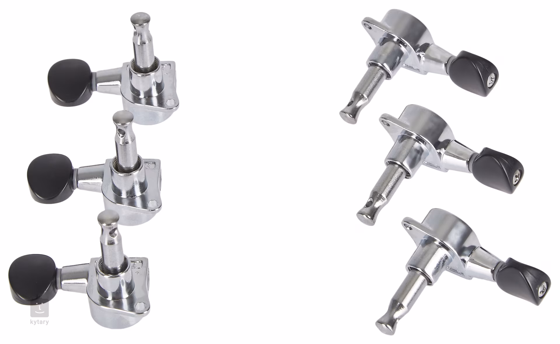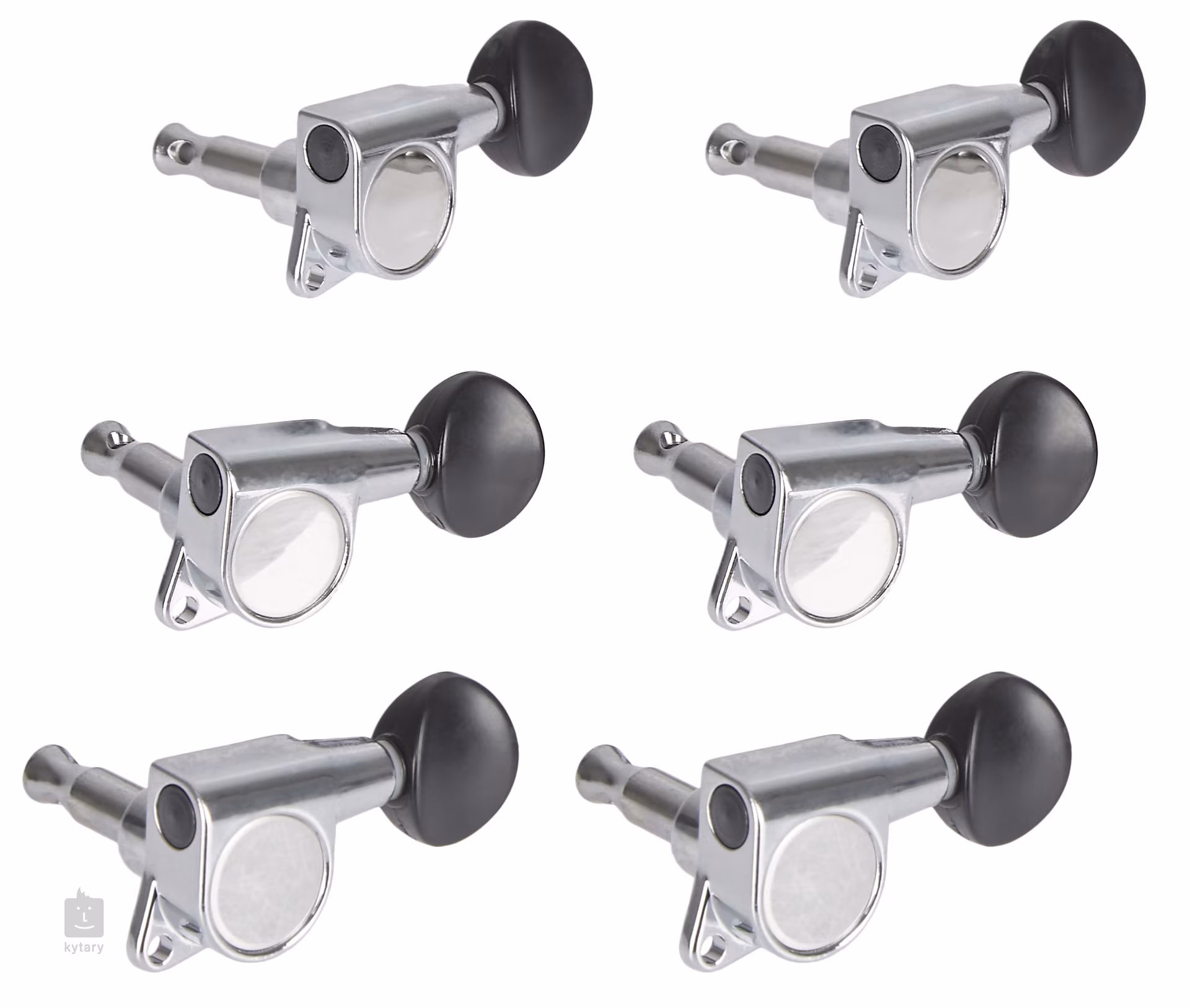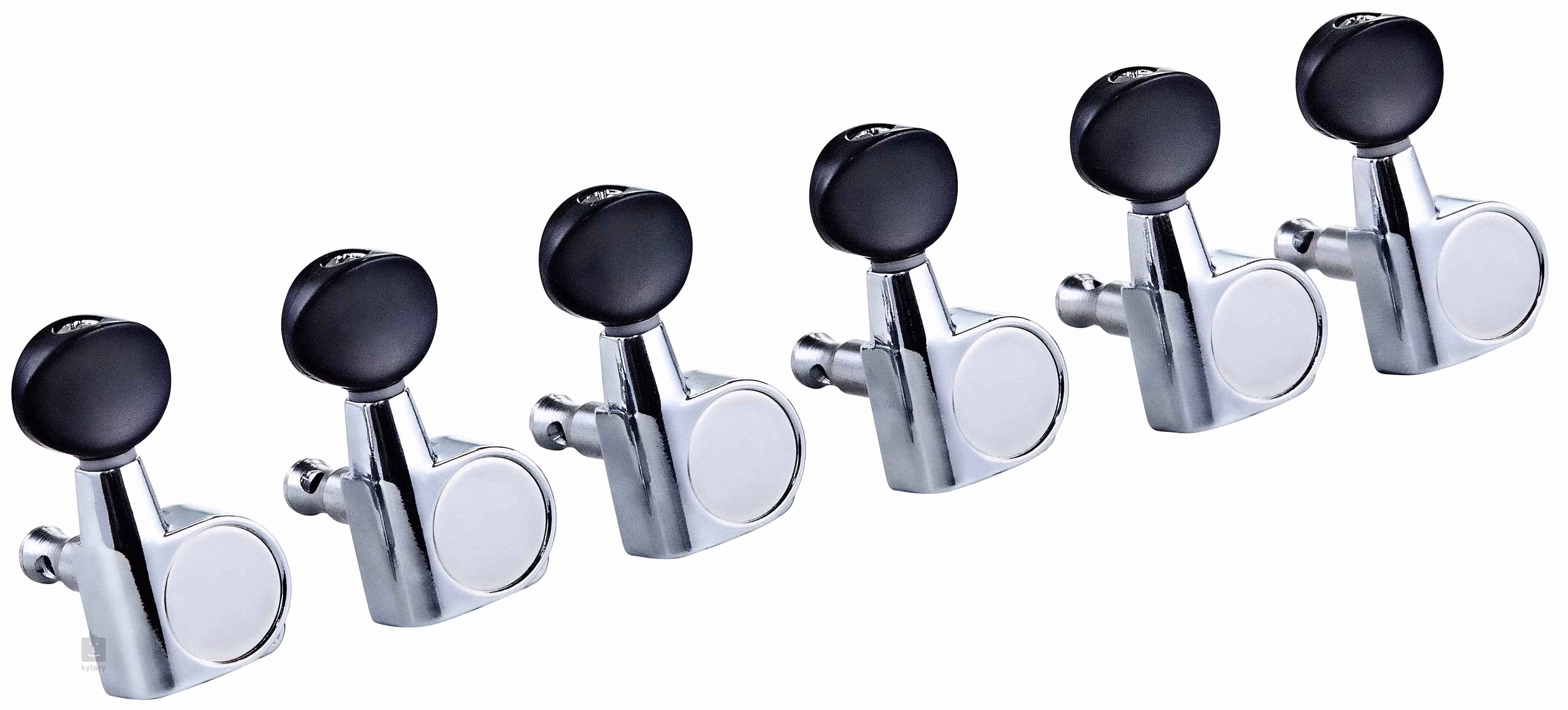Mechanizmy do strojenia gitary elektrycznej. Wykonane są z metalu w chromowanym wykończeniu, kołki wykonane są z wytrzymałego czarnego plastiku. Nadaje się do instrumentów z sześcioma mechanizmami w jednym rzędzie.