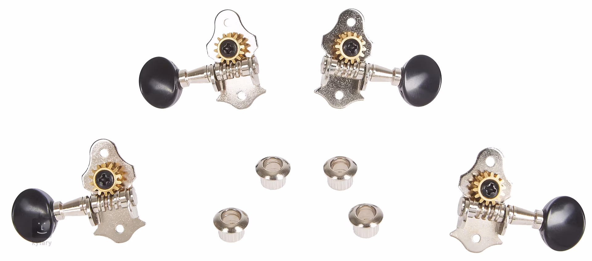 Otwarta mechanika strojenia do ukulele. Wykonane są z metalu w wykończeniu niklowym, kołki wykonane są z wytrzymałego czarnego plastiku ABS.