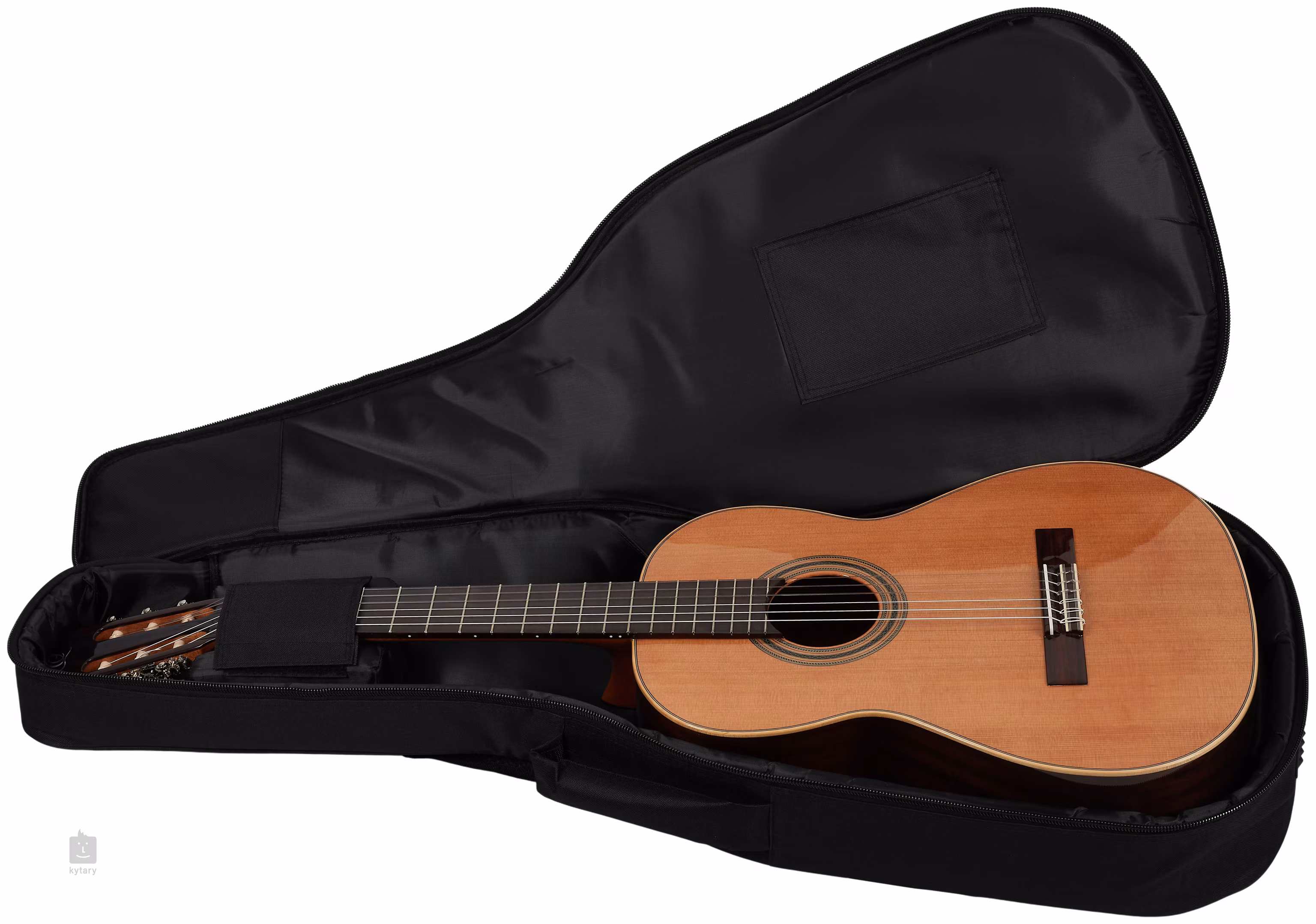 Struny są zamocowane przez zerowy i siodełkowy próg z kości w klasycznych mechanizmach strojących i palisandrowym mostku. Ładne wykończenie podkreśla lakier wypolerowany na wysoki połysk, klonowa obwódka i logo firmy na główce instrumentu.