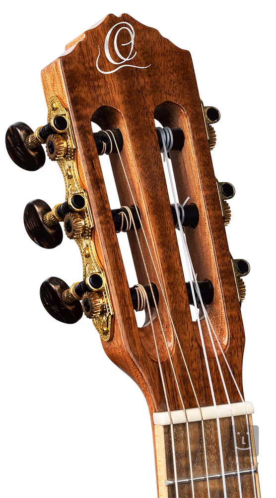 Gitara ukulele Ortega RGLE18ACA posiada pół-masywną konstrukcję z litą akacjową płytą rezonansową oraz litym akacjowym tyłem i bokami. Do mahoniowej szyjki przyklejona jest orzechowa podstrunnica z osiemnastoma progami. Struny są zamontowane w klasycznej złotej otwartej mechanice i orzechowej podstrunnicy. Precyzyjne wykonanie podkreśla klonowy binding korpusu uzupełniony imitacją inkrustacji z masy perłowej, bindingiem podstrunnicy i klonowym środkowym paskiem z tyłu.
