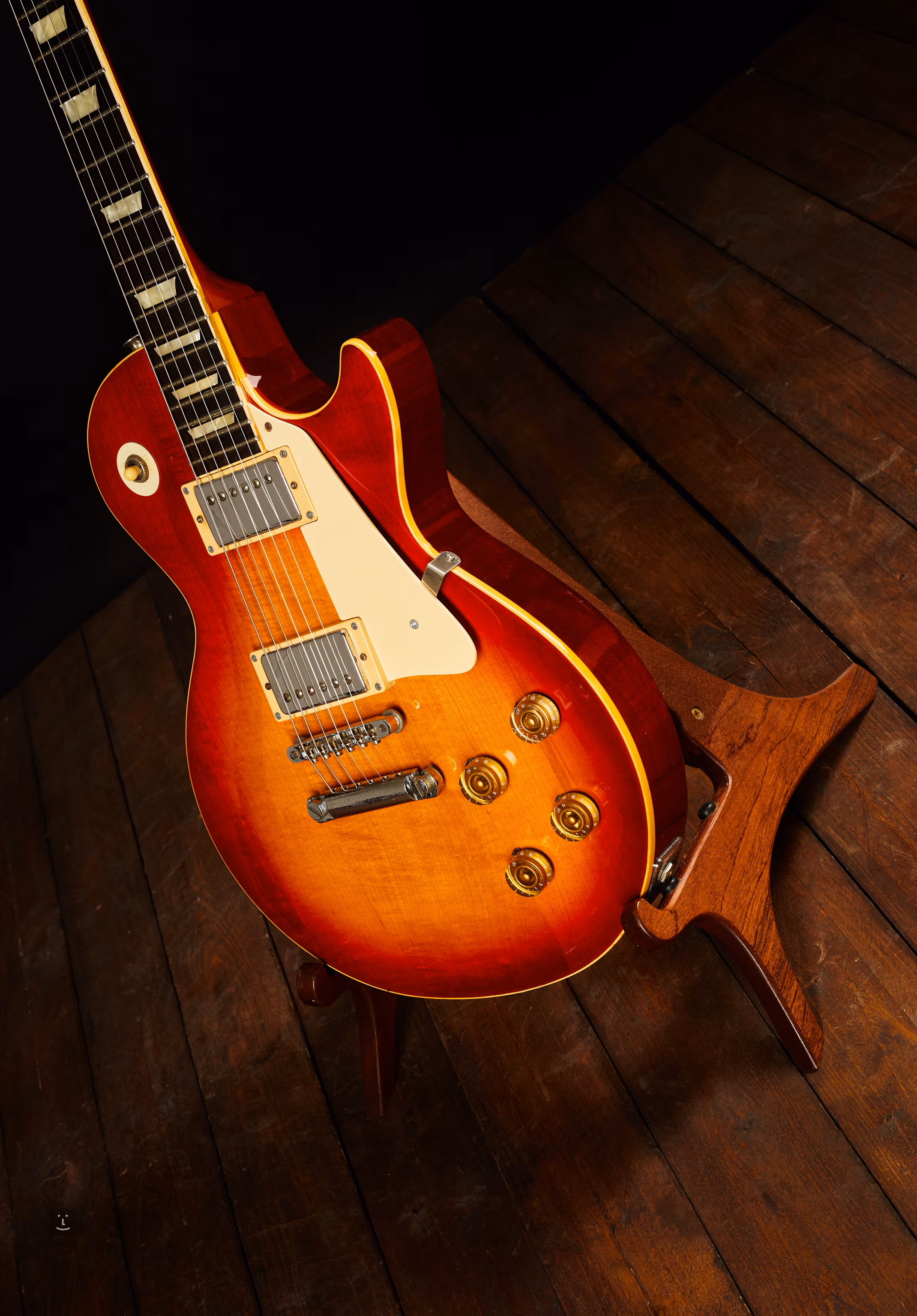 Instrument był prawdopodobnie w przeszłości ponownie tłoczony, ale hardware i pickupy wyglądają na oryginalne z wyjątkiem śrubek w maskownicach pickupów. Bouchanec na tylnej części szyjki, a także na główce, ogólnie stan bardzo dobry.