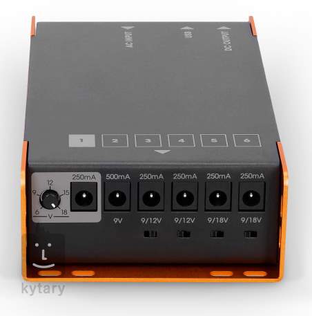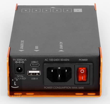 PWT 06 IEC to uniwersalny multi-adapter Palmera, który oferuje sześć izolowanych wyjść do zasilania efektów gitarowych - jedno standardowe 9V o maksymalnym poborze 500 mA i pięć przełączanych wyjść (2x 9/12V, 2x 9/18V i 1x 6/9/12/15/18V) o maksymalnym poborze 250 mA. Dostępne są również dwa wyjścia USB (USB-A i USB-C) do ładowania urządzeń mobilnych lub zasilania klawiszy MIDI oraz wyjście 9V DC (2000 mA) do podłączenia innego multi-adaptera Palmer PWT 04.