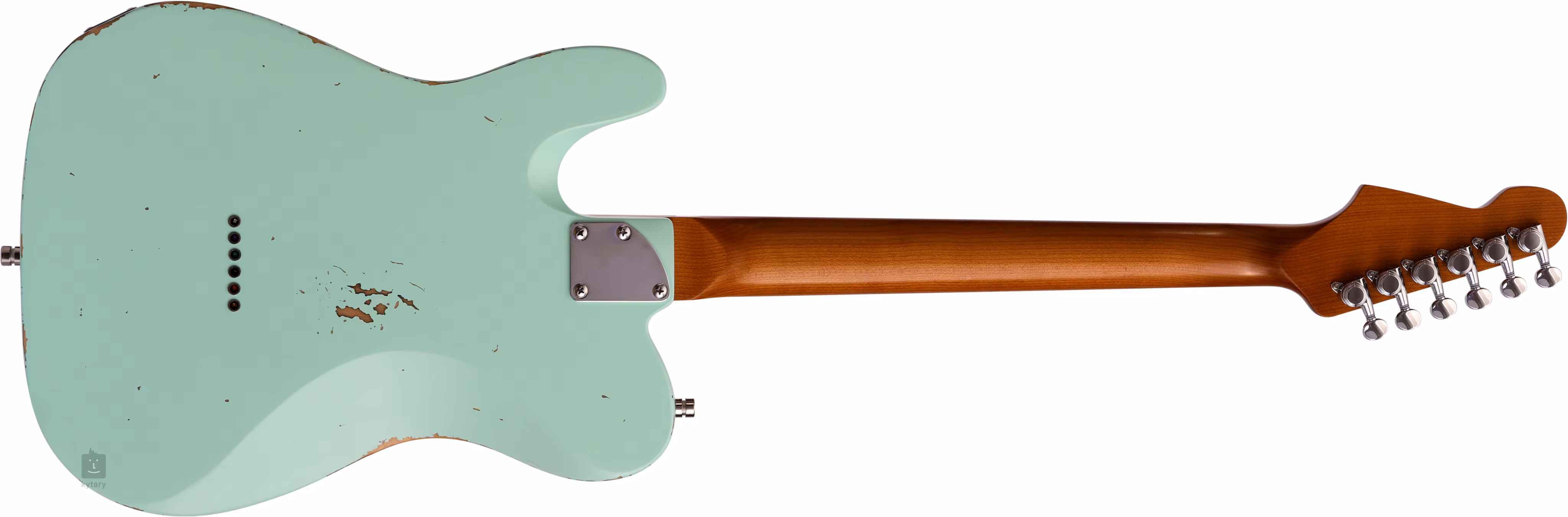 Korpus gitary elektrycznej PT-6 SFG R wykonany z drewna paulownia jest ozdobiony ręcznie nakładanym lakierem nitrocelulozowym i postarzanym wykończeniem z elementami sztucznej patyny. Po co czekać dziesiątki lat na odpowiedni vintage'owy wygląd i klimat, skoro można je mieć od razu. Do klonowego gryfu przyklejono palisandrowy podstrunnicę z dwudziestoma dwoma progami ze stali nierdzewnej w rozmiarze Jumbo. Dzięki obróbce cieplnej gryf jest bardziej stabilny, a jednocześnie zyskuje przyjemny złocisty wygląd vintage. Płaska promień podstrunnicy (13,75 cala) nie pochodzi z katalogu gitar vintage, ale dzięki temu gitara może zainteresować również bardziej nowoczesnych graczy. Orientację na podstrunnicy, nawet w ciemności, ułatwiają luminescencyjne kropki na boku.