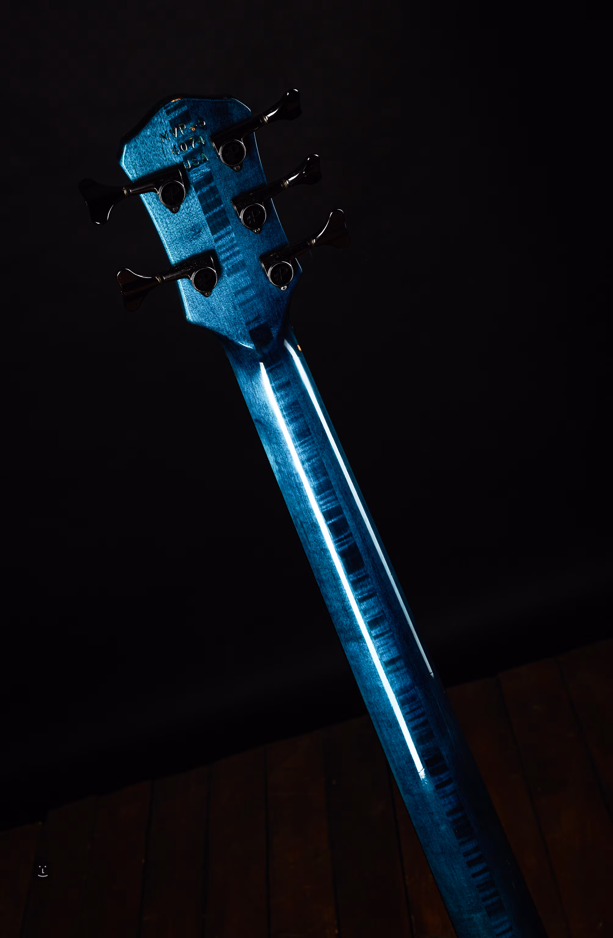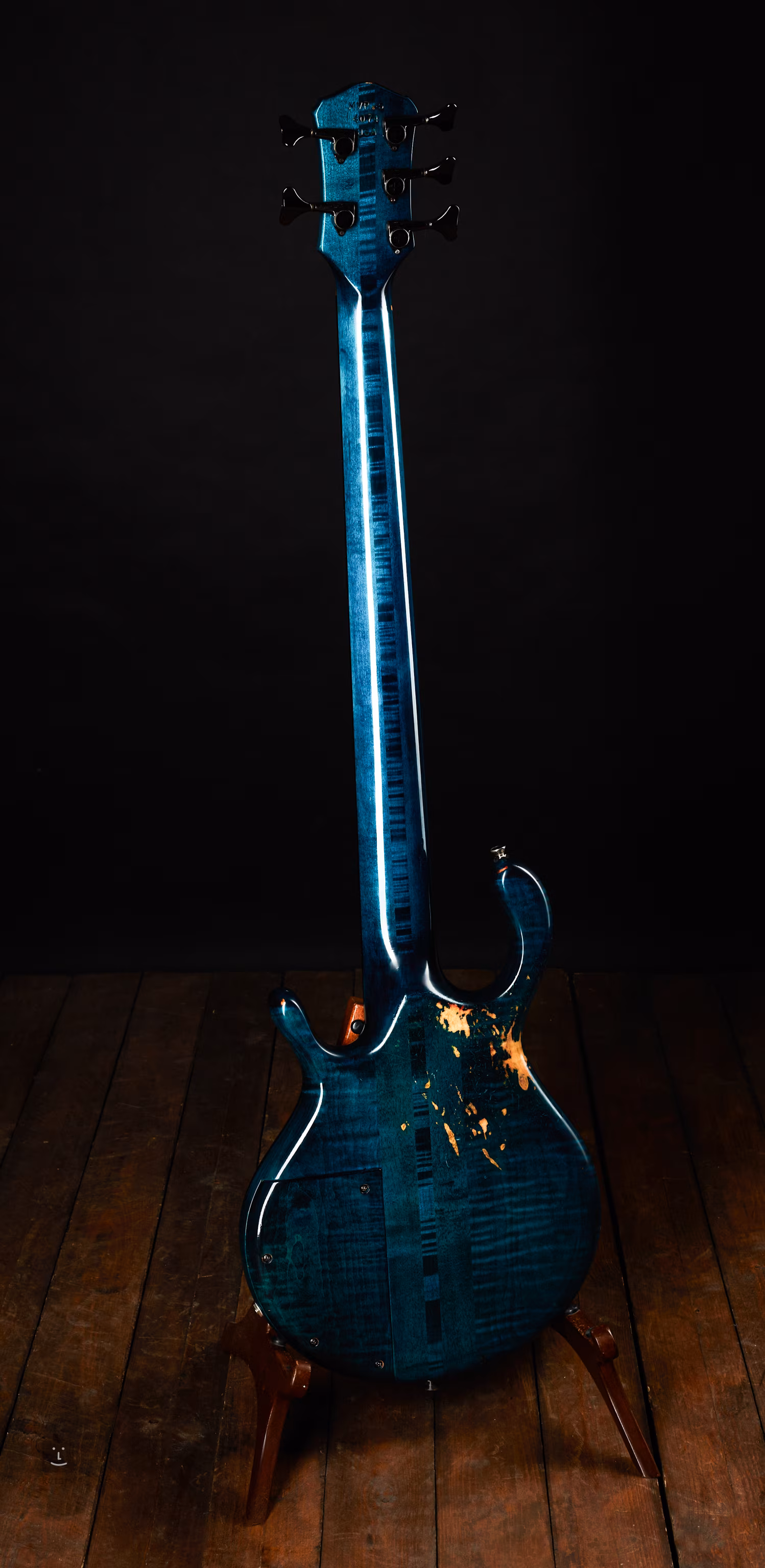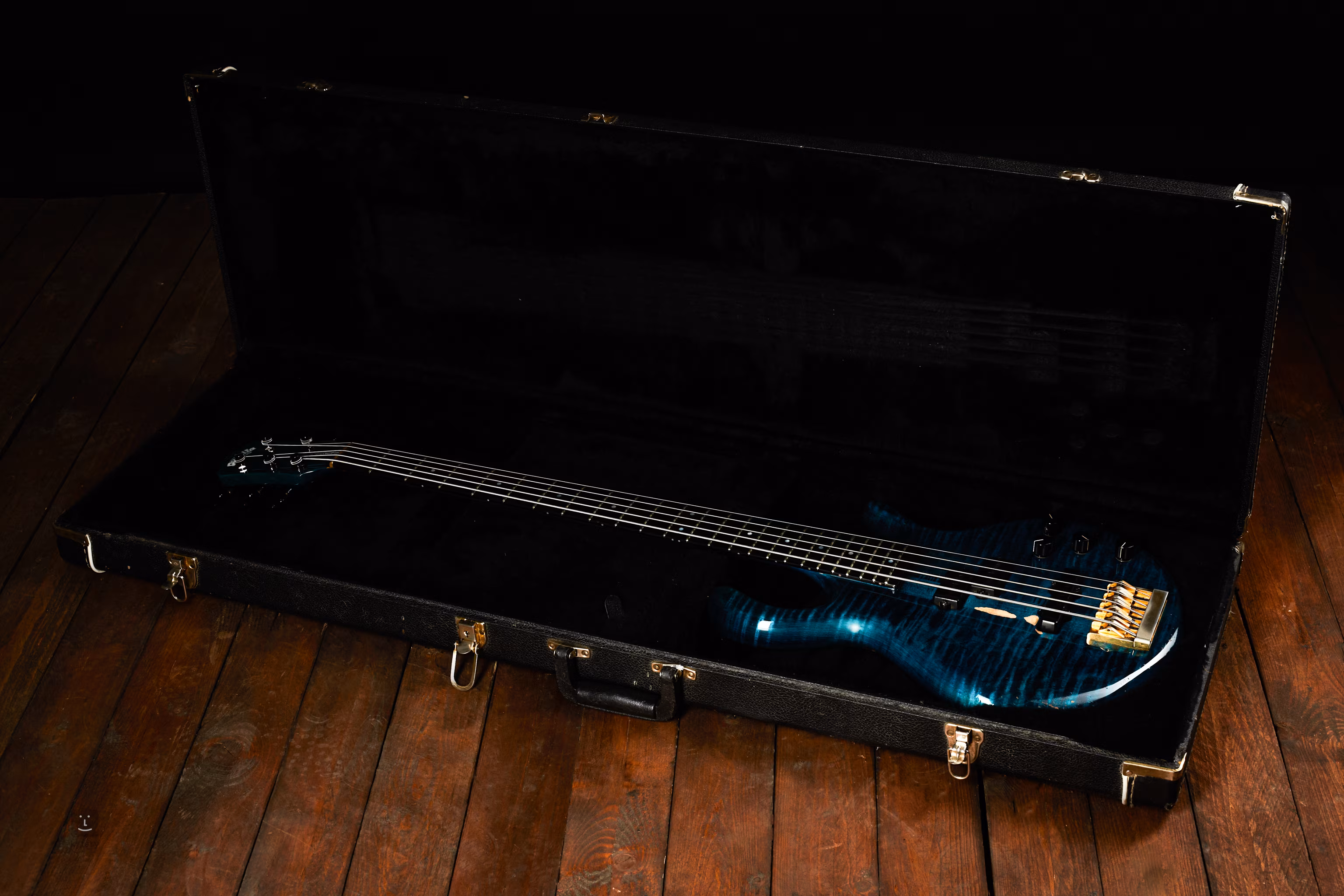 Ten instrument w przezroczystym niebieskim lakierze nosi wiele drobnych otarć, z tyłu znajdują się liczne uderzenia taśmy, mimo to instrument jest w idealnym stanie jeśli chodzi o grywalność. W zestawie znajduje się również oryginalne etui. Poprzedni właściciel ze względów estetycznych wymienił złote mechaniki na czarne (oryginalne Pedulla), w zestawie są oryginalne.