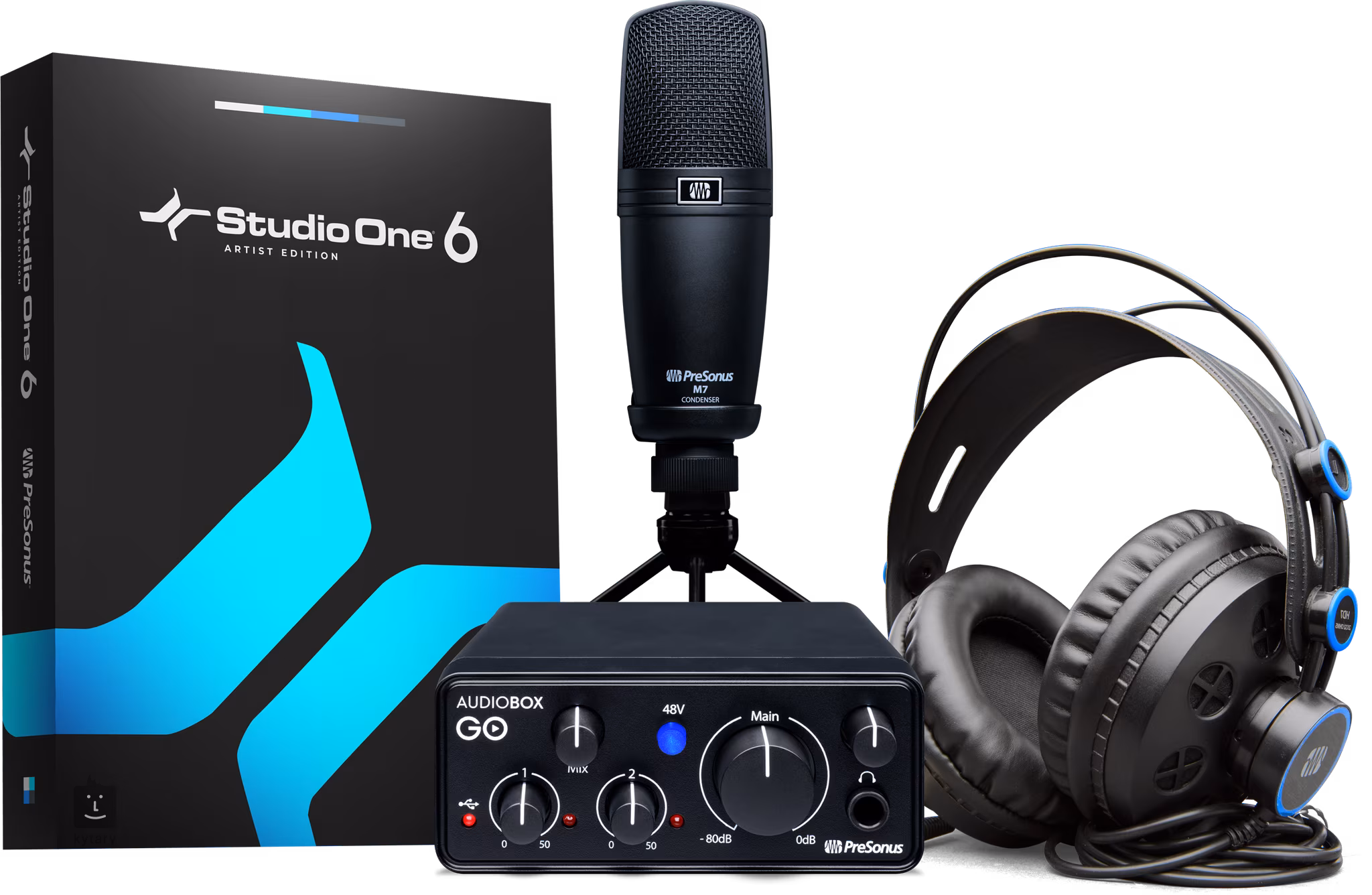 AudioBox GO Creator Bundle od Presonus to zestaw do nagrywania w domu, który zawiera wszystko, czego potrzebujesz, aby rozpocząć komponowanie, nagrywanie i miksowanie własnych utworów. Znajdziesz w nim kartę dźwiękową AudioBox GO USB, mikrofon pojemnościowy M7, profesjonalne słuchawki studyjne HD7 oraz sześciomiesięczny dostęp do oprogramowania do nagrywania Studio One+. Krótko mówiąc, wszystko, czego potrzebujesz do tworzenia dźwięku o jakości studyjnej.