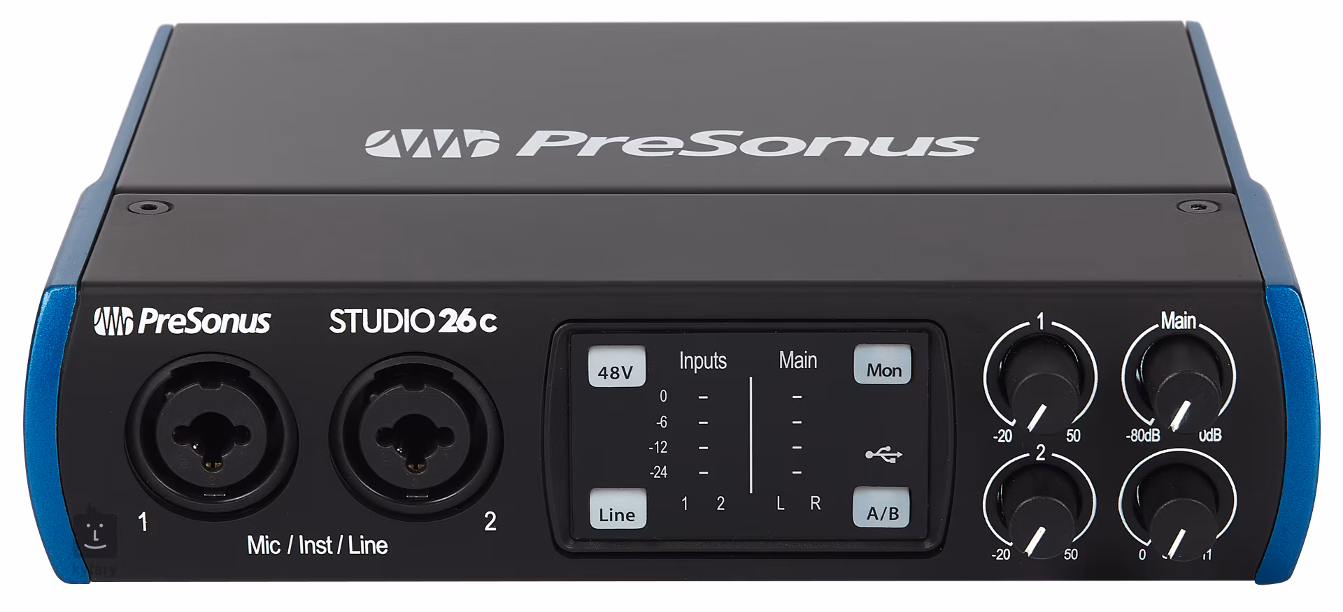 Presonus Studio 26 to kompaktowy interfejs odpowiedni do domowych studiów, gdzie może być używany do profesjonalnego nagrywania, nagrywania pomysłów, podcastingu, DJingu lub jako interfejs MIDI. Do dyspozycji są dwa wejścia mic/line z regulacją wzmocnienia, cztery wyjścia analogowe oraz wyjście słuchawkowe z przełącznikiem A/B do wyboru sygnału z pierwszego lub drugiego wejścia. Wbudowane wejście i wyjście MIDI ułatwia podłączenie syntezatora lub kontrolera MIDI do komputera.