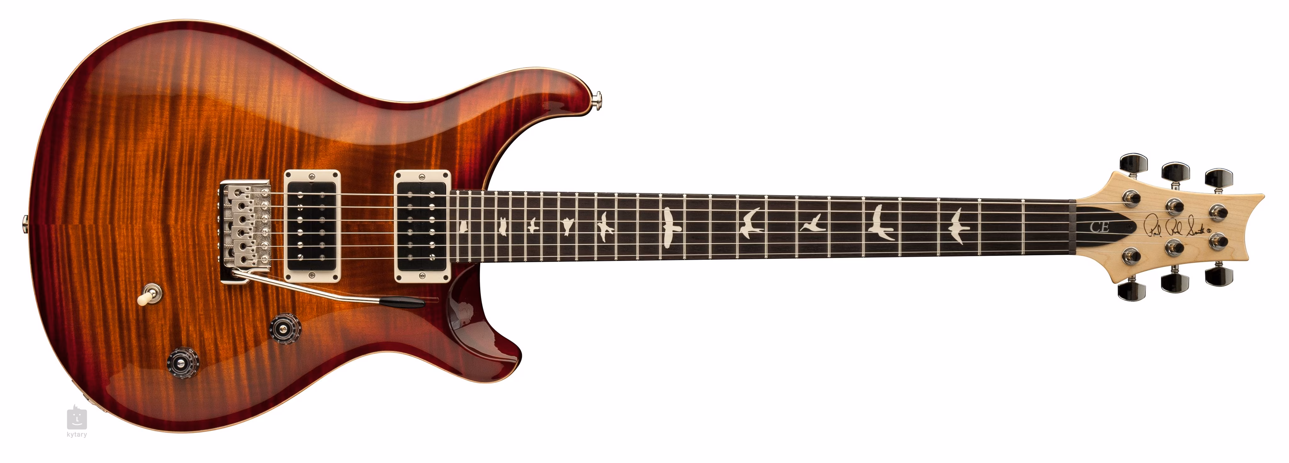 Ergonomicznie ukształtowany mahoniowy korpus gitary CE 24 Dark Cherry Sunburst z charakterystyczną dla PRS konstrukcją double-cut jest ozdobiony fantazyjnie figurowanym klonowym topem i błyszczącym lakierem nitro. Palisandrowa podstrunnica z dwudziestoma czterema progami jest przyklejona do klonowej szyjki o profilu Pattern Thin. Znaczniki pozycji w postaci sylwetek ptaków z masy perłowej ułatwiają orientację na podstrunnicy.