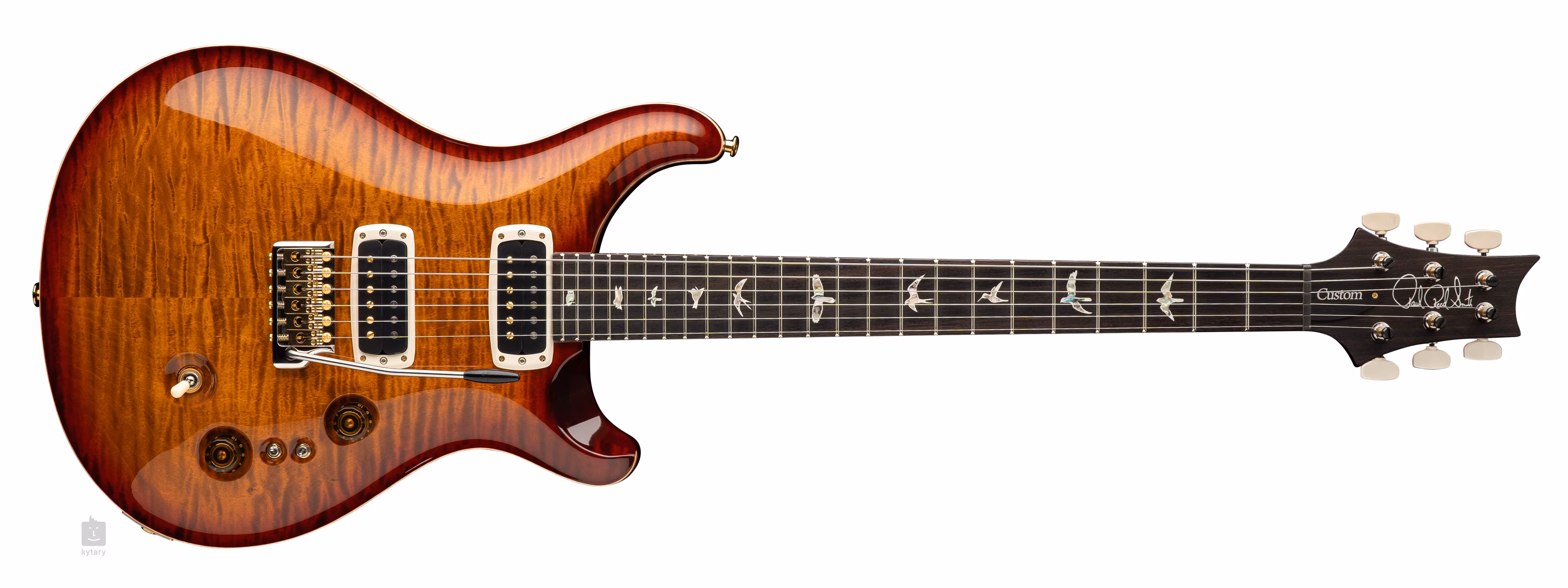 Model Custom 24-08 Dark Cherry Sunburst już na pierwszy rzut oka przyciąga wzrok połączeniem ergonomicznie ukształtowanego mahoniowego korpusu z typowym dla PRS podwójnym wycięciem i figuralnym klonowym topem o chłodnym usłojeniu. Jednoczęściowa mahoniowa szyjka o profilu Pattern Thin jest połączona z palisandrową podstrunnicą z dwudziestoma czterema progami. Orientację na podstrunnicy ułatwiają markery pozycji PRS w postaci sylwetek ptaków z masy perłowej.