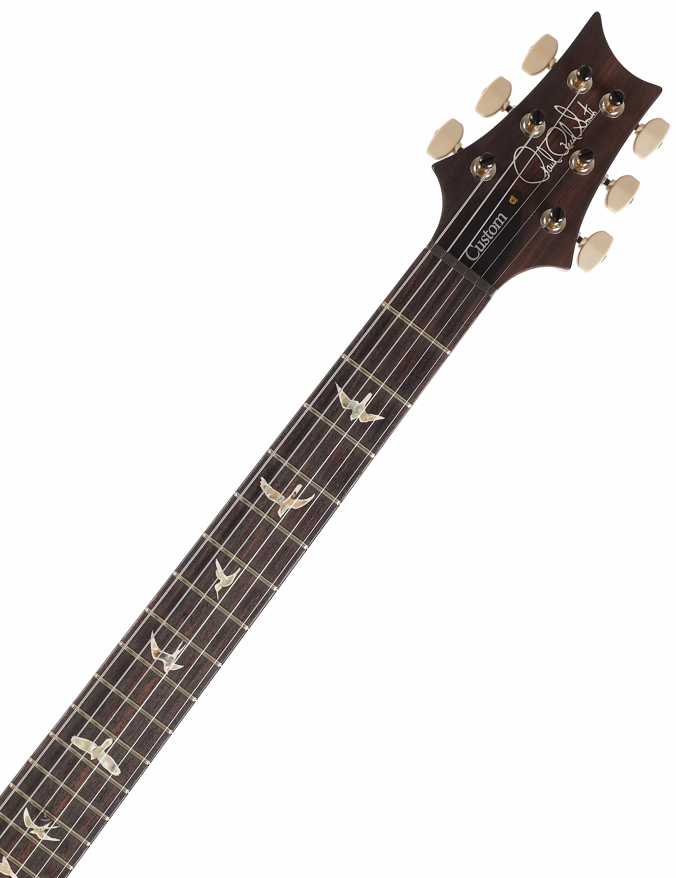 Model Custom 24 10 Top Cobalt Smokeburst oferuje połączenie klonowego topu z ekskluzywnym wzorem "dead spot-free" (10 Top) i ergonomicznie ukształtowanego mahoniowego korpusu z typowym dla PRS podwójnym wycięciem. Mahoniowa szyjka o profilu Pattern Thin jest przyklejona do palisandrowej podstrunnicy wyposażonej w luksusowe znaczniki pozycji z masy perłowej w kształcie sylwetek ptaków.