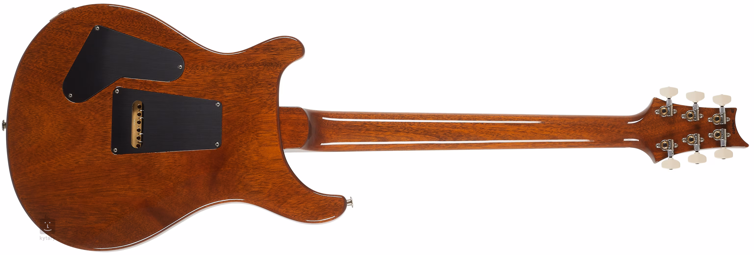 Model Custom 24 Black Gold przyciąga wzrok już na pierwszy rzut oka dzięki połączeniu ergonomicznie ukształtowanego mahoniowego korpusu z typowym dla PRS podwójnym wycięciem i figuralnym klonowym topem z chłodnym usłojeniem drewna. Jednoczęściowa mahoniowa szyjka o profilu Pattern Thin jest przyklejona do palisandrowej podstrunnicy wyposażonej w dwadzieścia cztery progi. Orientację na podstrunnicy ułatwiają markery pozycji PRS w postaci sylwetek ptaków z masy perłowej.