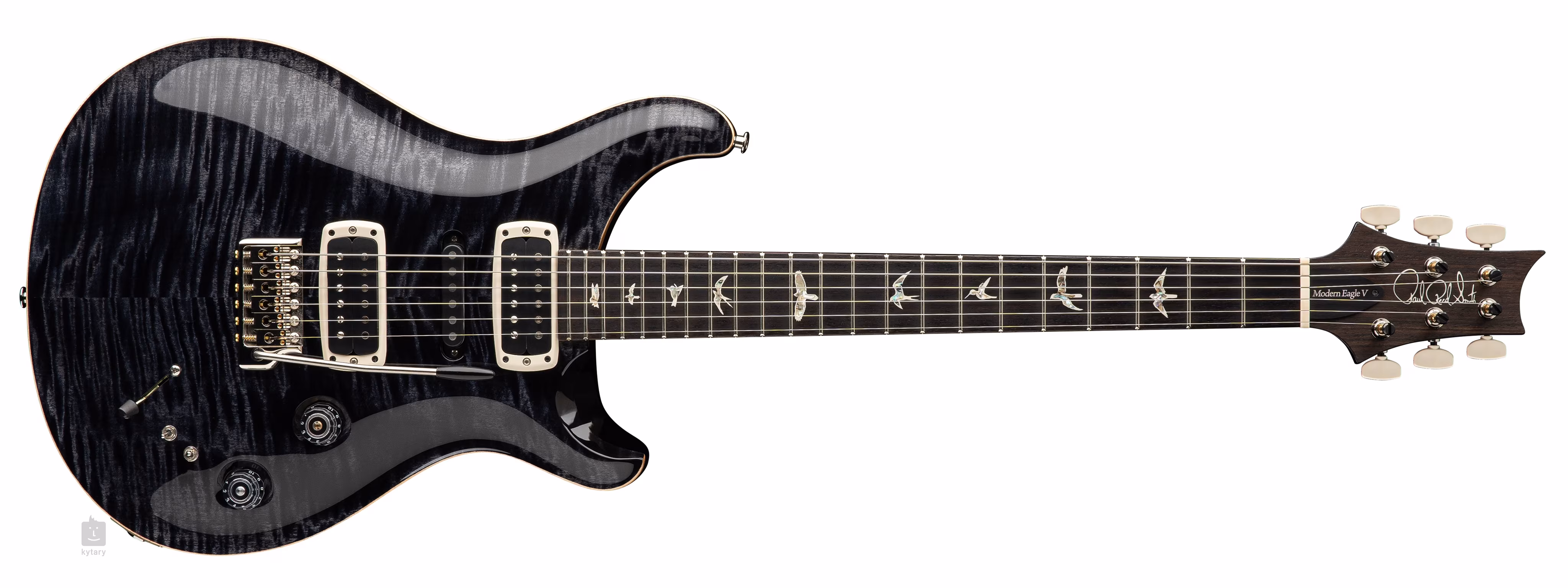 PRS Modern Eagle V to nowoczesna gitara elektryczna w konstrukcji PRS double-cut z konfiguracją przetworników H-S-H, którą docenisz w studiu i na scenie. Ergonomicznie ukształtowany mahoniowy korpus Modern Eagle V Gray Black jest ozdobiony klonowym topem i błyszczącym lakierem nitro. Jednoczęściowa mahoniowa szyjka o profilu Pattern jest przyklejona do palisandrowej podstrunnicy wyposażonej w dwadzieścia dwa progi. Orientację na podstrunnicy ułatwiają markery pozycji PRS w postaci luksusowych sylwetek ptaków z masy perłowej.
