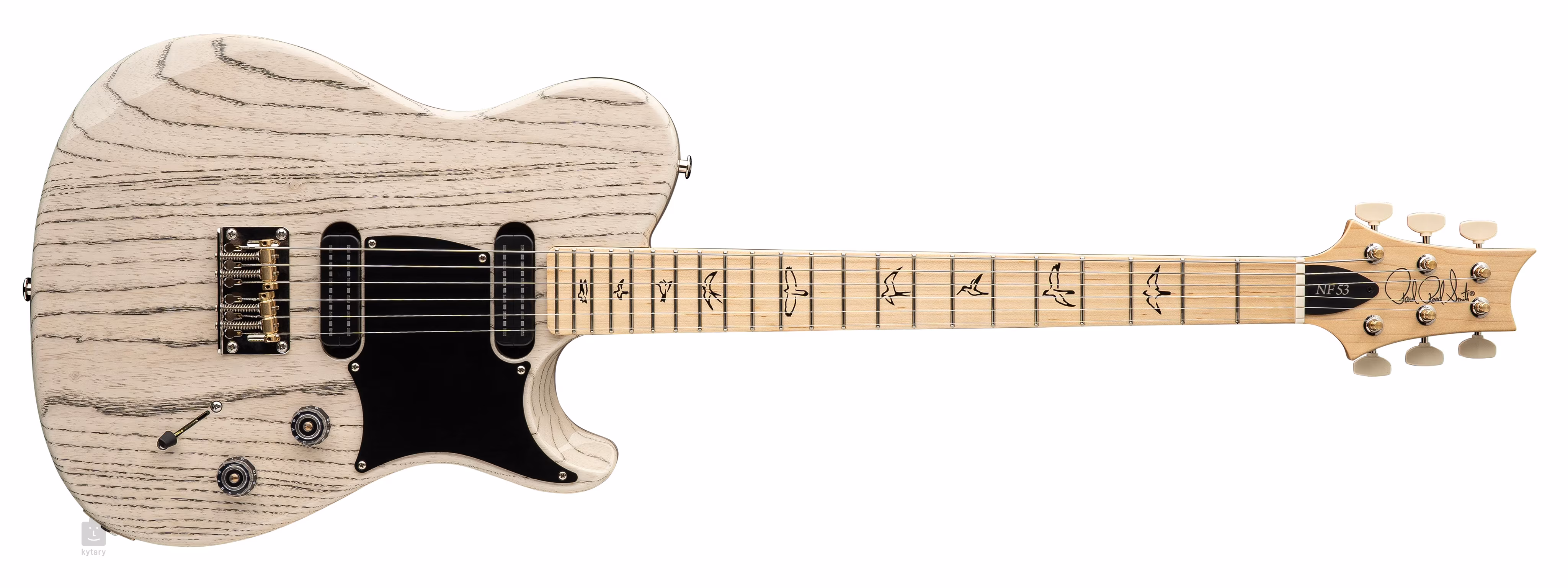 Korpus gitary NF 53 White Doghair wykonany jest z jesionu bagiennego. Komfort gry gwarantuje przykręcana klonowa szyjka z profilem Pattern 53, który oferuje aspekty profili Pattern Vintage i Pattern Regular i jest nieco węższy na progu zerowym niż zwykły standard PRS. Znaczniki pozycji w postaci sylwetek ptaków ułatwiają orientację na klonowej podstrunnicy.