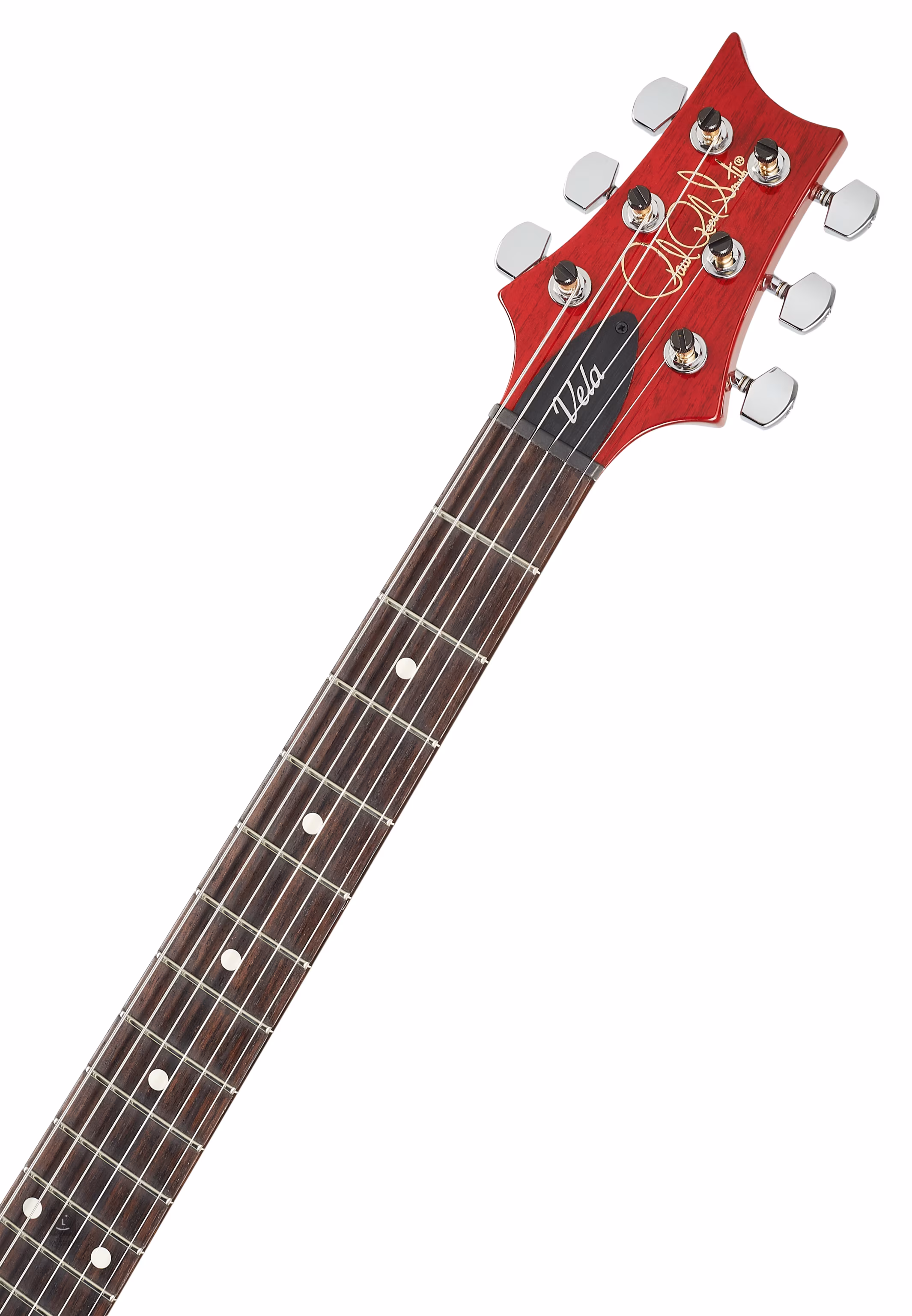 Its pickguard-loaded electronics feature a PRS-Designed DS-01 pickup in the bridge, providing a bright, chimey tone and the Type-D Singlecoil in the neck that gives the Vela some noteworthy bite. The coil-tap on the tone control allows the bridge pickup to split to singlecoils, providing a balanced tone that will cut through the mix with style. Anchoring this guitar is the PRS plate-style bridge with two saddles that were designed to compensate for intonation. This bridge harkens back to Paul’s early designs and traditional bass plate-style bridges, but is top-loading for easy restringing. Like the bridge found on Paul’s Guitar and some Private Stock models, PRS’s plate-style bridge features brass saddles and an aluminum plate for maximum tonal sustain.