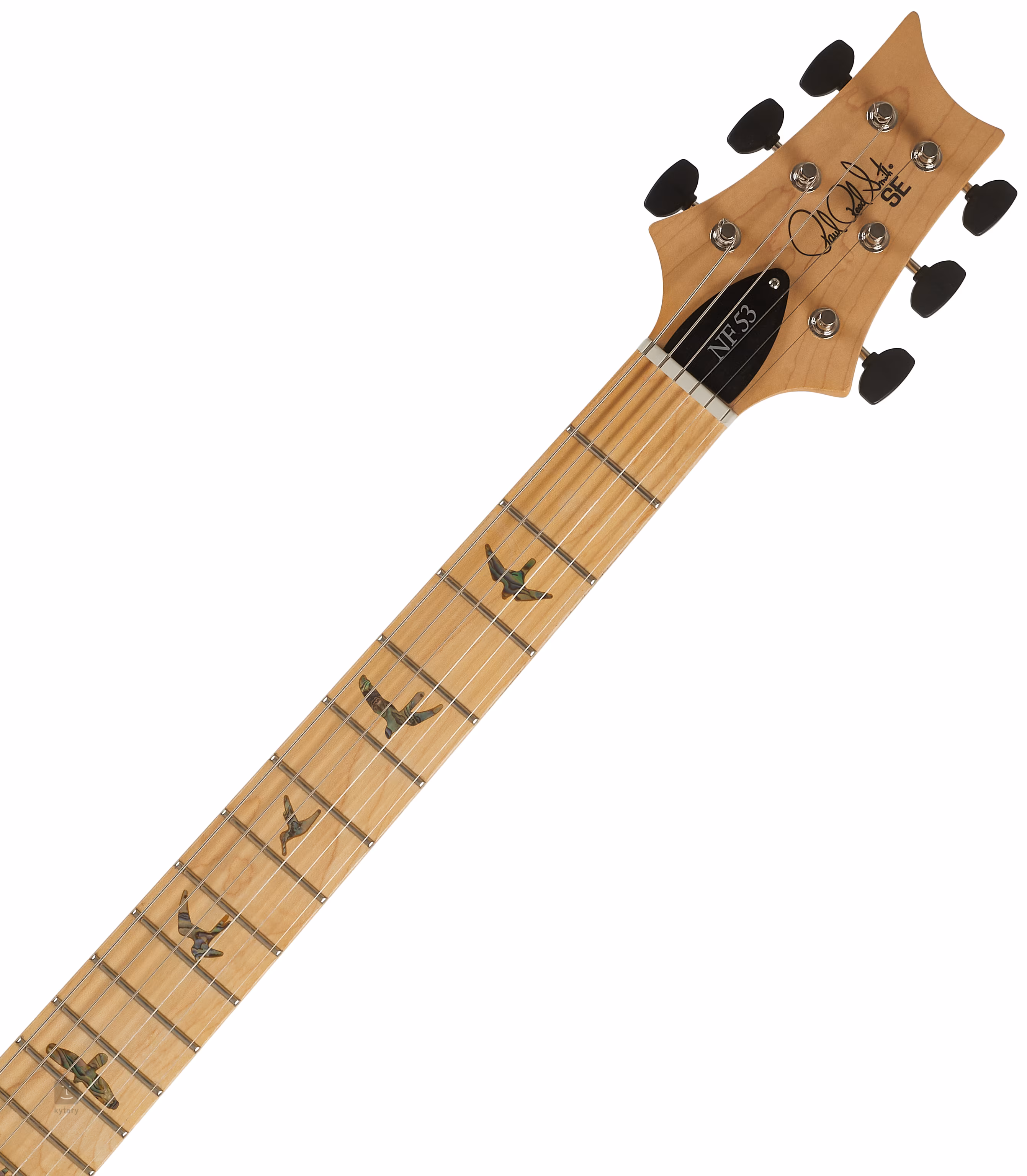 Korpus gitary elektrycznej SE NF 53 Black Doghair 2026 jest wykonany z jesionu bagiennego. Komfort gry zapewnia przykręcany klonowy gryf, który przy zerowym progu jest nieco węższy niż standardowy gryf PRS. Orientację na klonowej podstrunnicy ułatwiają znaczniki pozycji w postaci sylwetek ptaków.