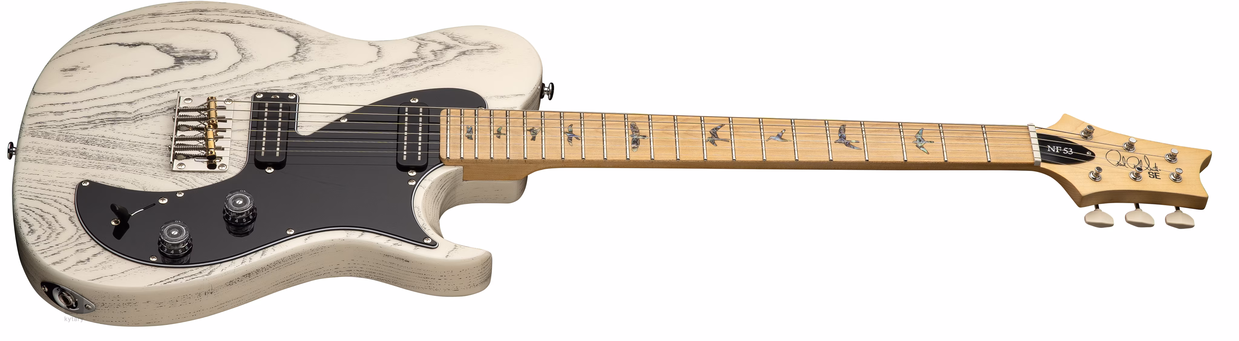 Korpus gitary elektrycznej SE NF 53 White Doghair został wykonany z jesionu bagiennego. Komfort gry gwarantuje przykręcana klonowa szyjka, która jest nieco węższa na progu zerowym niż standardowy PRS. Znaczniki pozycji w postaci sylwetek ptaków na klonowej podstrunnicy ułatwiają orientację.