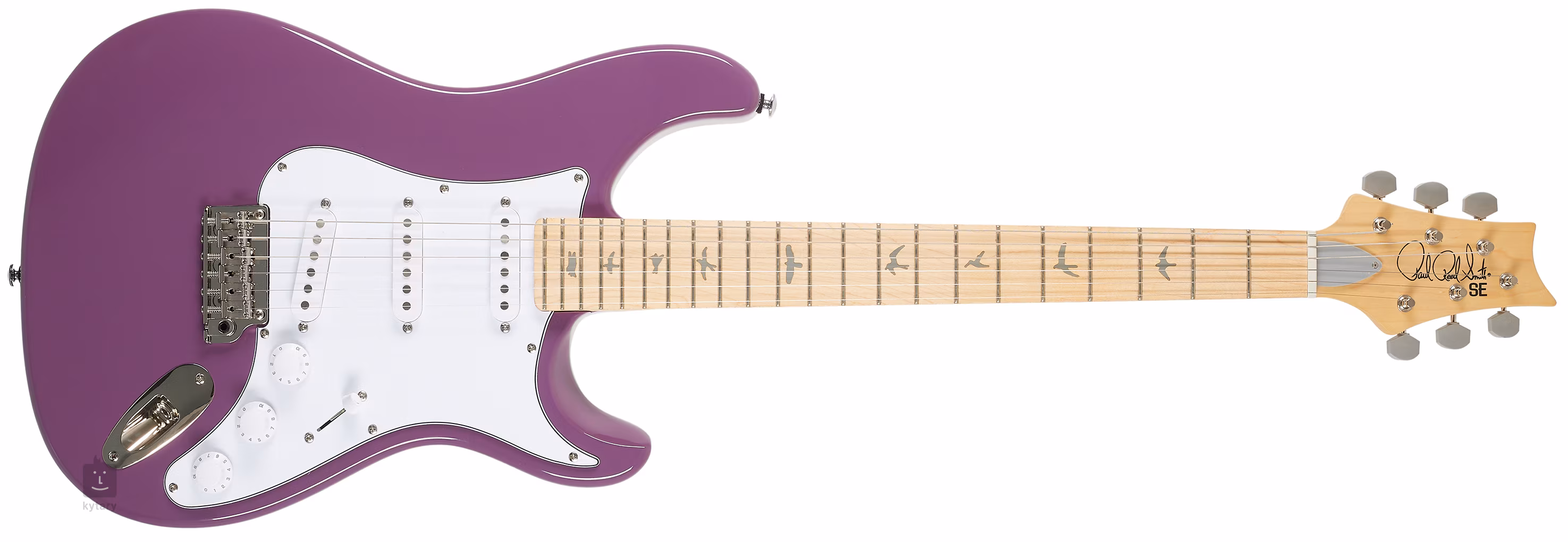 Korpus gitary PRS SE Silver Sky Maple Summit Purple wykonany jest z topoli. Przykręcana klonowa szyjka posiada oryginalny cutaway/profil 635JM, z klonową powierzchnią podstrunnicy podzieloną przez dwadzieścia dwa progi i znaczniki pozycji w postaci sylwetek ptaków.