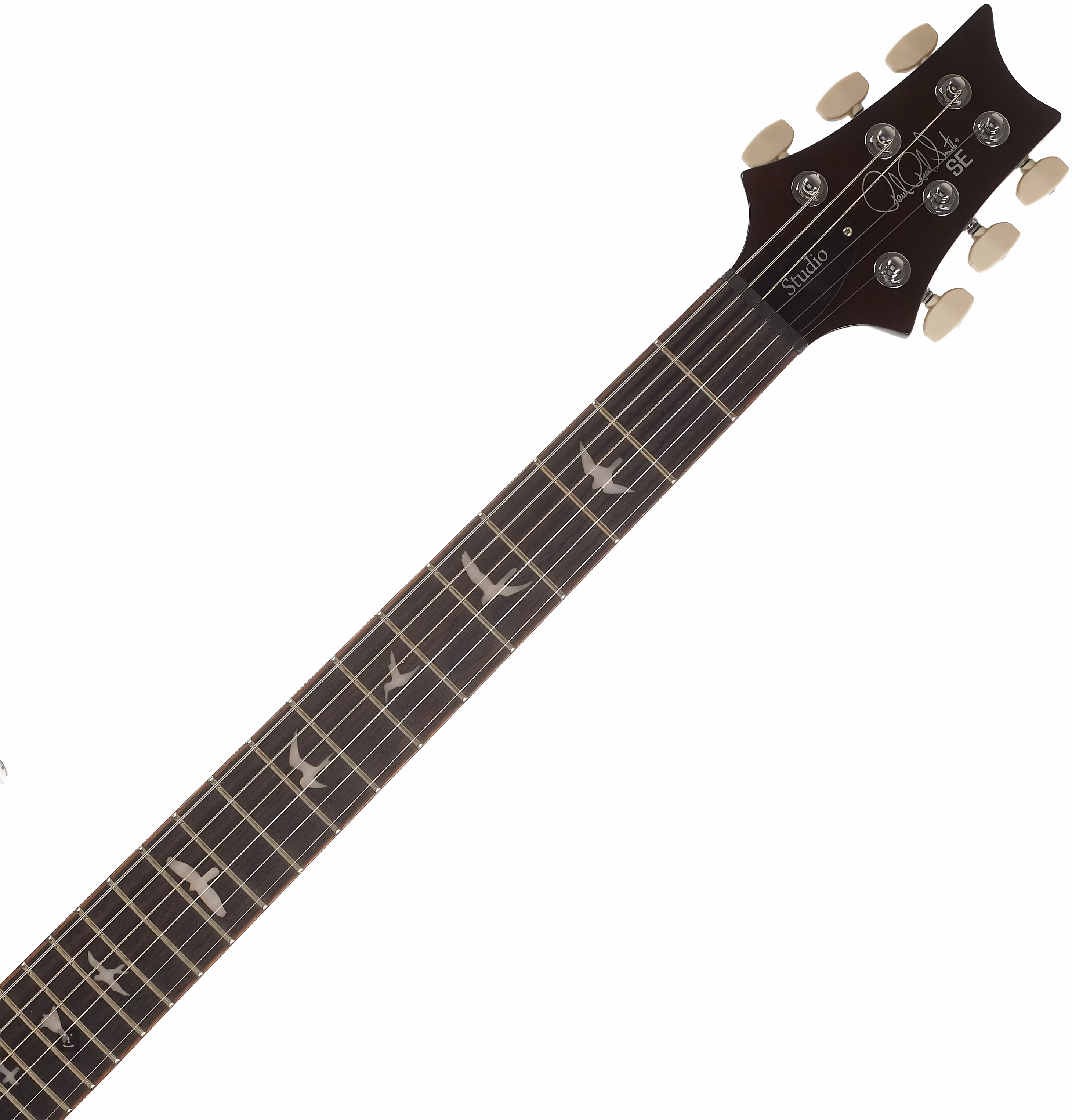 Korpus gitary SE Studio Orange Tiger Smokeburst 2026 z mahoniu z typowym podwójnym wycięciem PRS zdobi klonowy top i efektowna okleina z klonu figurowego. Wycięcie Shallow Violin carve zbliża właściwości gry tego instrumentu do droższych amerykańskich modeli serii Core. Do klonowego gryfu o profilu Wide Thin przyklejono palisandrowy podstrunnicę z dwudziestoma progami. Orientację na podstrunnicy ułatwiają znaczniki pozycji PRS w postaci sylwetek ptaków.