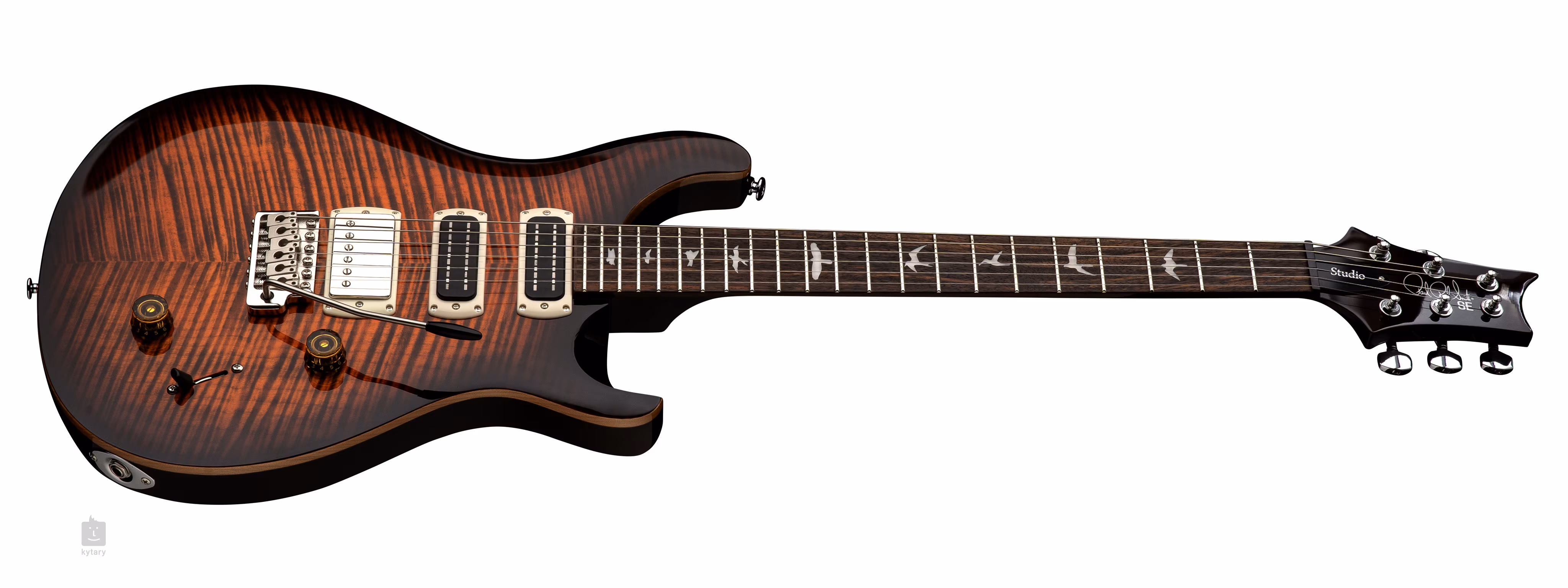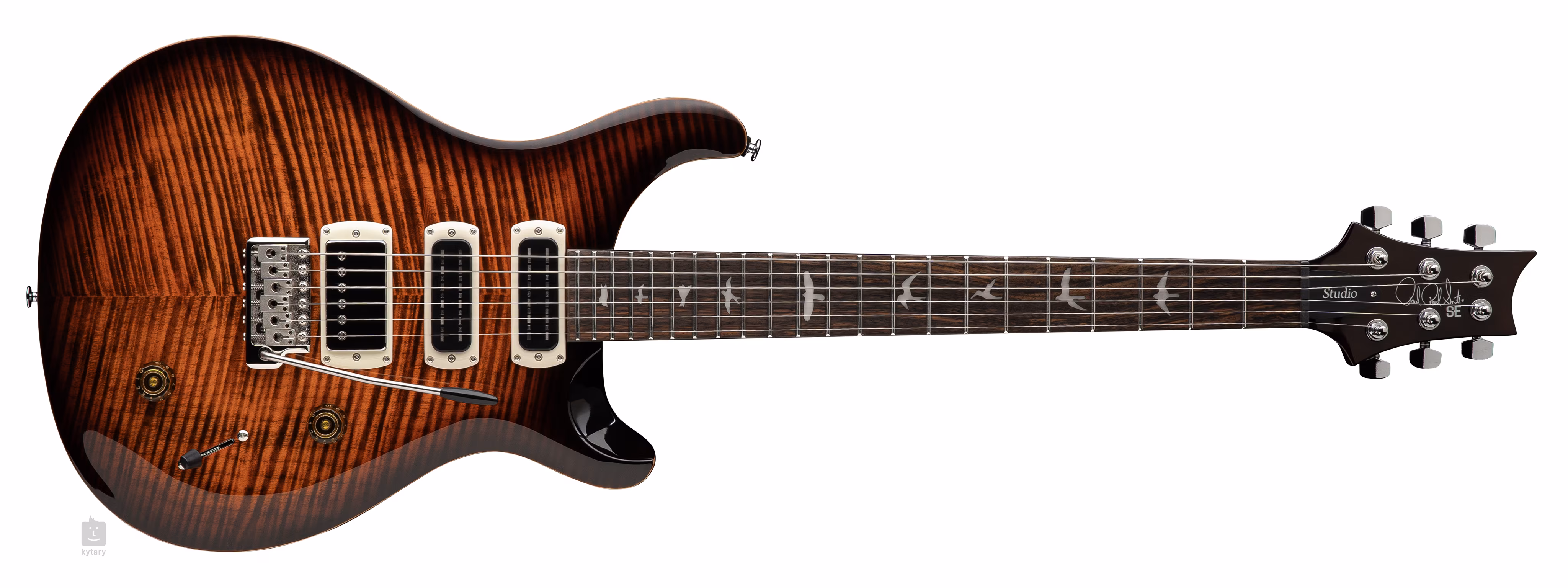 Mahoniowy korpus gitary PRS SE Studio Orange Tiger Smokeburst z typowym dla PRS podwójnym wycięciem jest ozdobiony klonowym topem i fantazyjną okleiną z klonu figured. Rzeźba Shallow Violin zbliża jakość gry instrumentu do droższych modeli American Core Series. Palisandrowa podstrunnica z dwudziestoma dwoma progami jest przyklejona do klonowej szyjki o profilu Wide Thin. Orientację na podstrunnicy ułatwiają znaczniki pozycji PRS w postaci sylwetek ptaków.