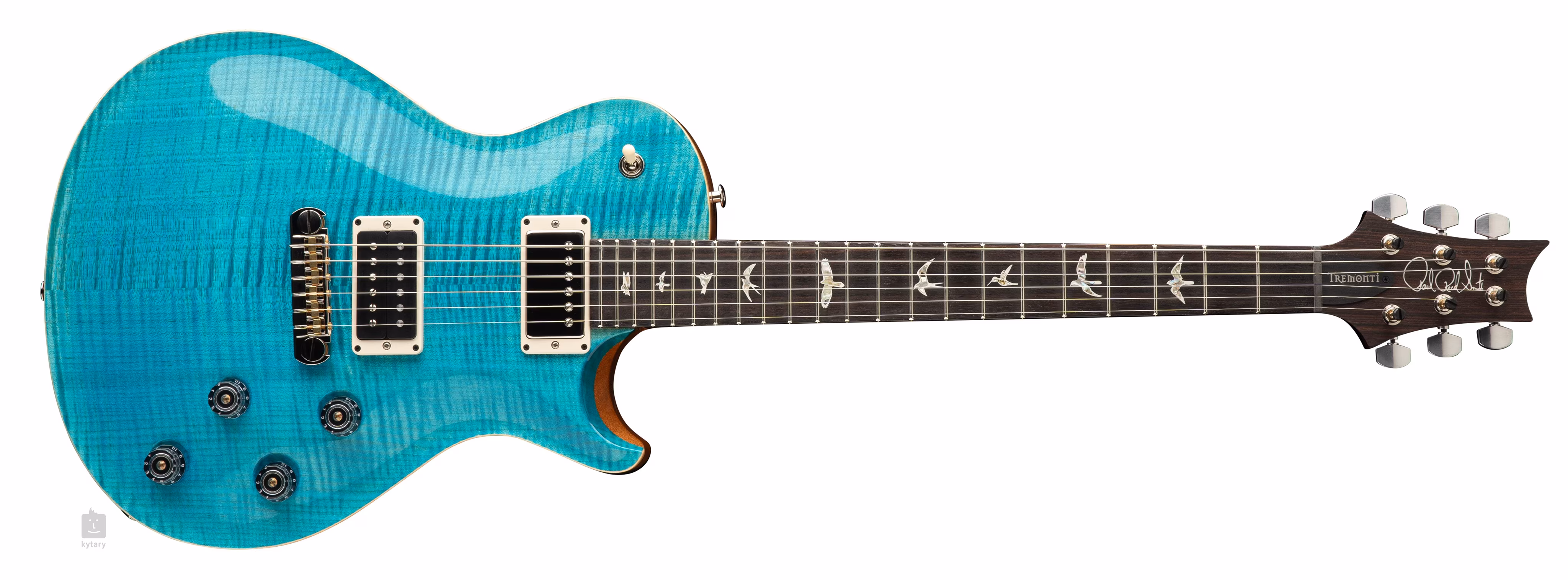 Single-cut PRS Tremonti Stoptail Carroll Blue to sygnowany model Marka Tremontiego, amerykańskiego gitarzysty znanego z zespołów Creed i Alter Bridge. Ergonomicznie ukształtowany mahoniowy korpus gitary jest ozdobiony figuralnym klonowym topem i błyszczącym lakierem nitro. Jednoczęściowa mahoniowa szyjka o profilu Pattern Thin jest przyklejona do palisandrowej podstrunnicy wyposażonej w dwadzieścia dwa progi. Orientację na podstrunnicy ułatwiają markery pozycji PRS w postaci luksusowych sylwetek ptaków z masy perłowej.
