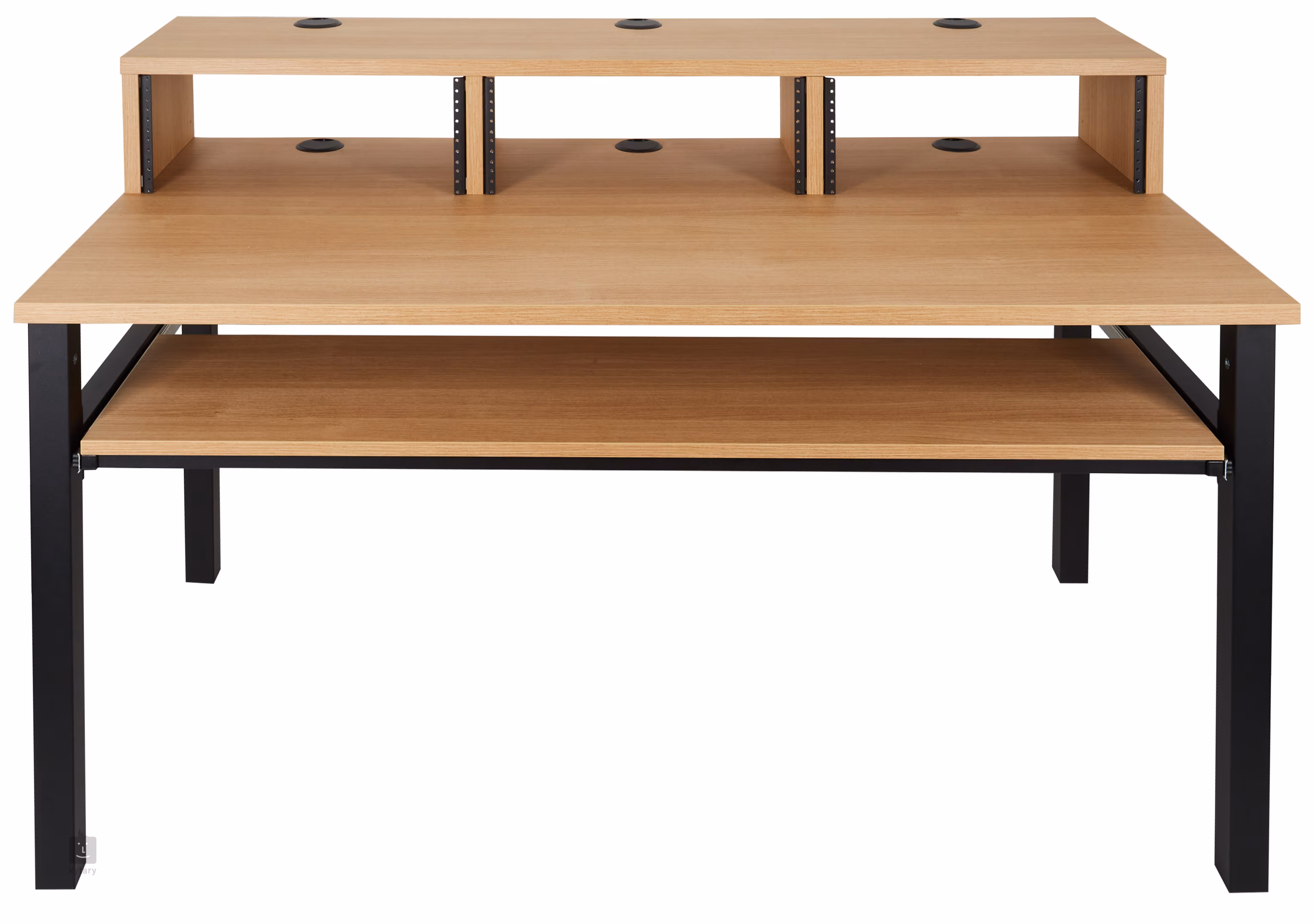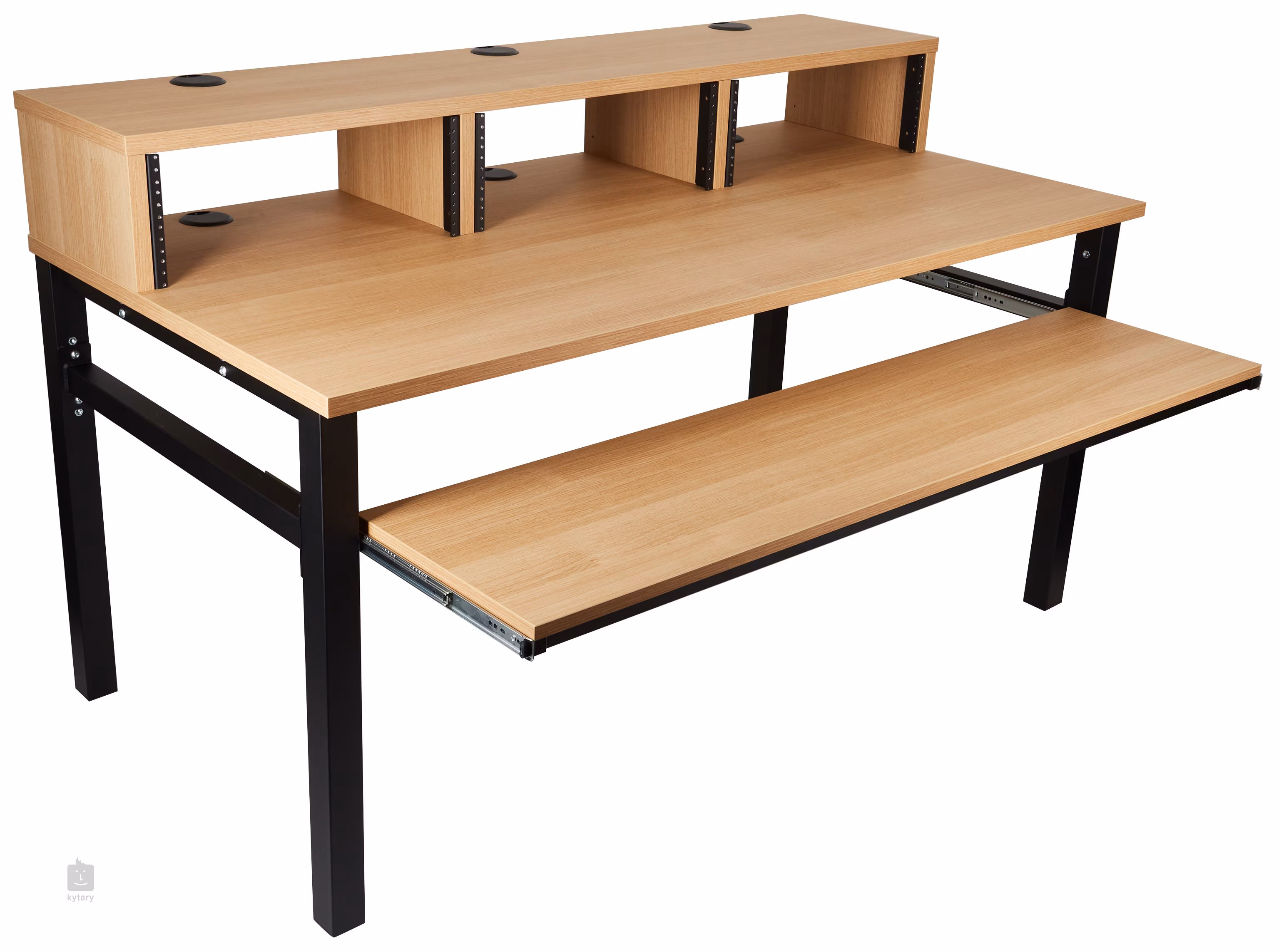 Stół posiada szufladę o ładowności 40 kg z systemem szuflad za poziomem nóg podczas siedzenia tak, że nawet nie wiesz, że stół posiada szufladę, ponadto szuflada jest regulowana na dwa poziomy wysokości. Oczywiście są też podwyższone cokoły na monitory studyjne, nawiercone otwory do perfekcyjnego prowadzenia kabli, czy trzy 19" stojaki na sprzęt montowany w szafach rack.
