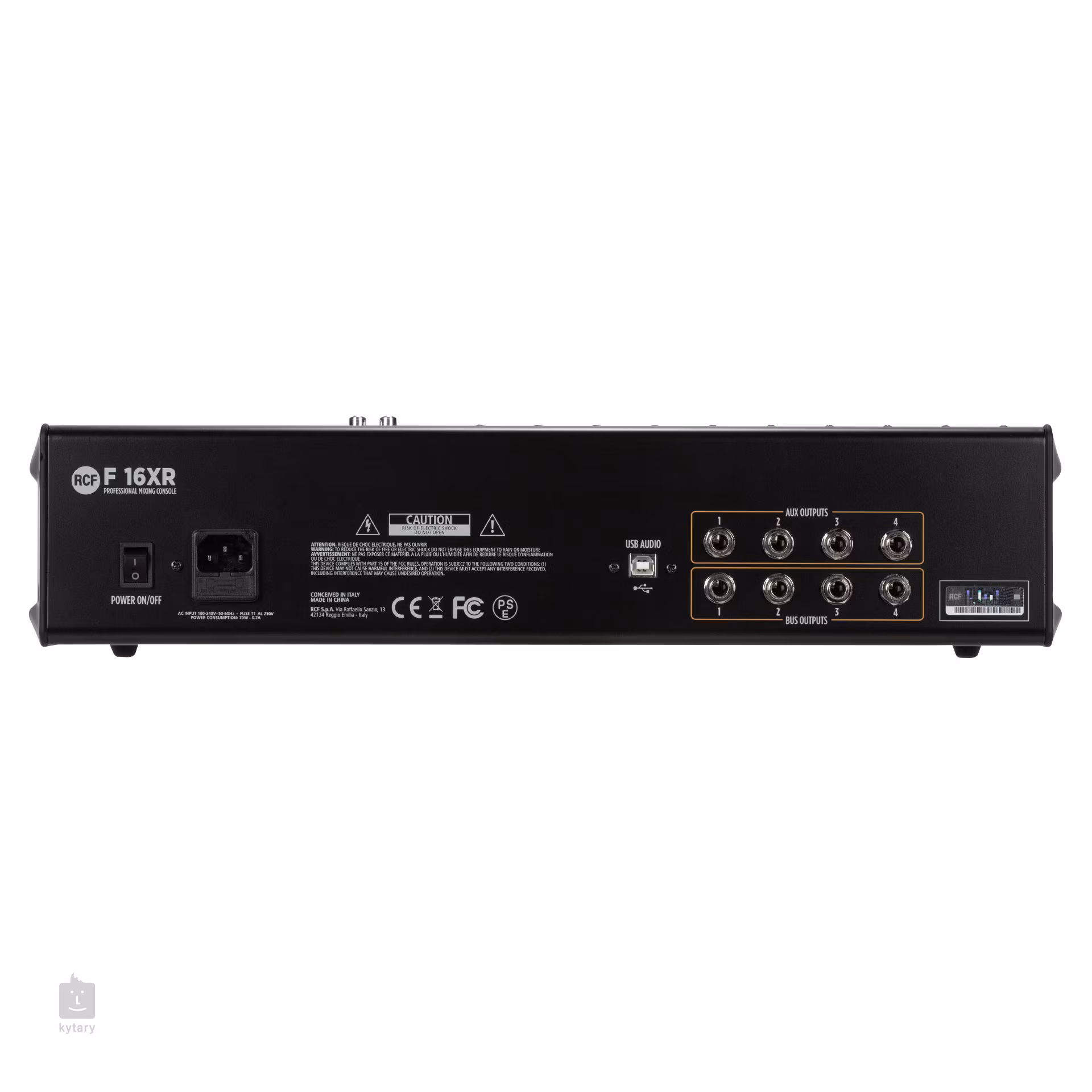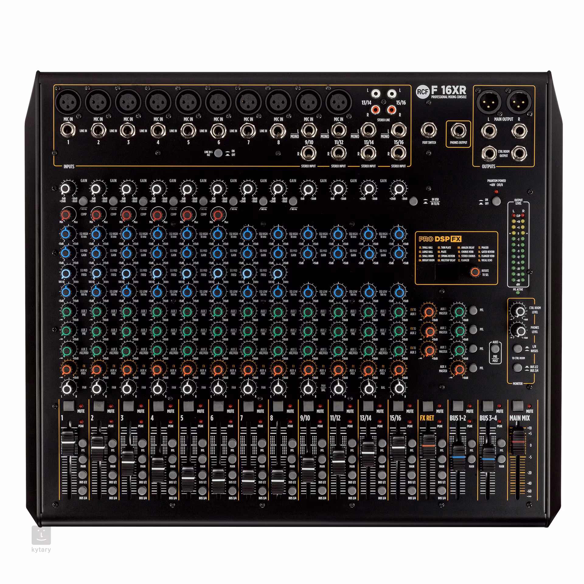 RCF F 16X to 16-kanałowa konsola mikserska z serii F, nowej generacji analogowych konsol mikserskich włoskiej marki RCF, która opiera się na dziedzictwie serii E i oferuje najwyższą jakość i profesjonalny dźwięk. Jego dużą atrakcją jest również zintegrowana jednostka efektów Pro DSP FX, która zapewnia szesnaście profesjonalnych efektów, w tym kilka rodzajów pogłosu (Hall, Room, Plate, Spring), opóźnienia (Mono, Stereo, Multitap), efekty modulacyjne, takie jak chorus i flanger, echo i wiele innych.