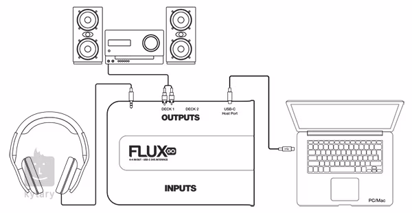 Dzięki interfejsowi audio 4×4 In/Out z podwójnymi wejściami i wyjściami stereo, Flux Go można łatwo zintegrować z szeroką gamą zestawów DJ-skich. Wejścia można indywidualnie przełączać między trybem Phono i Line za pomocą przełączników DIP, dzięki czemu można bez problemu podłączyć gramofony, odtwarzacze CD lub inne odtwarzacze. Praktyczny zacisk uziemiający zapewnia czysty sygnał podczas korzystania ze źródeł winylowych i pozwala przekształcić każdy mikser DJ-ski w pełnoprawny system DVS przy minimalnym wysiłku technicznym.