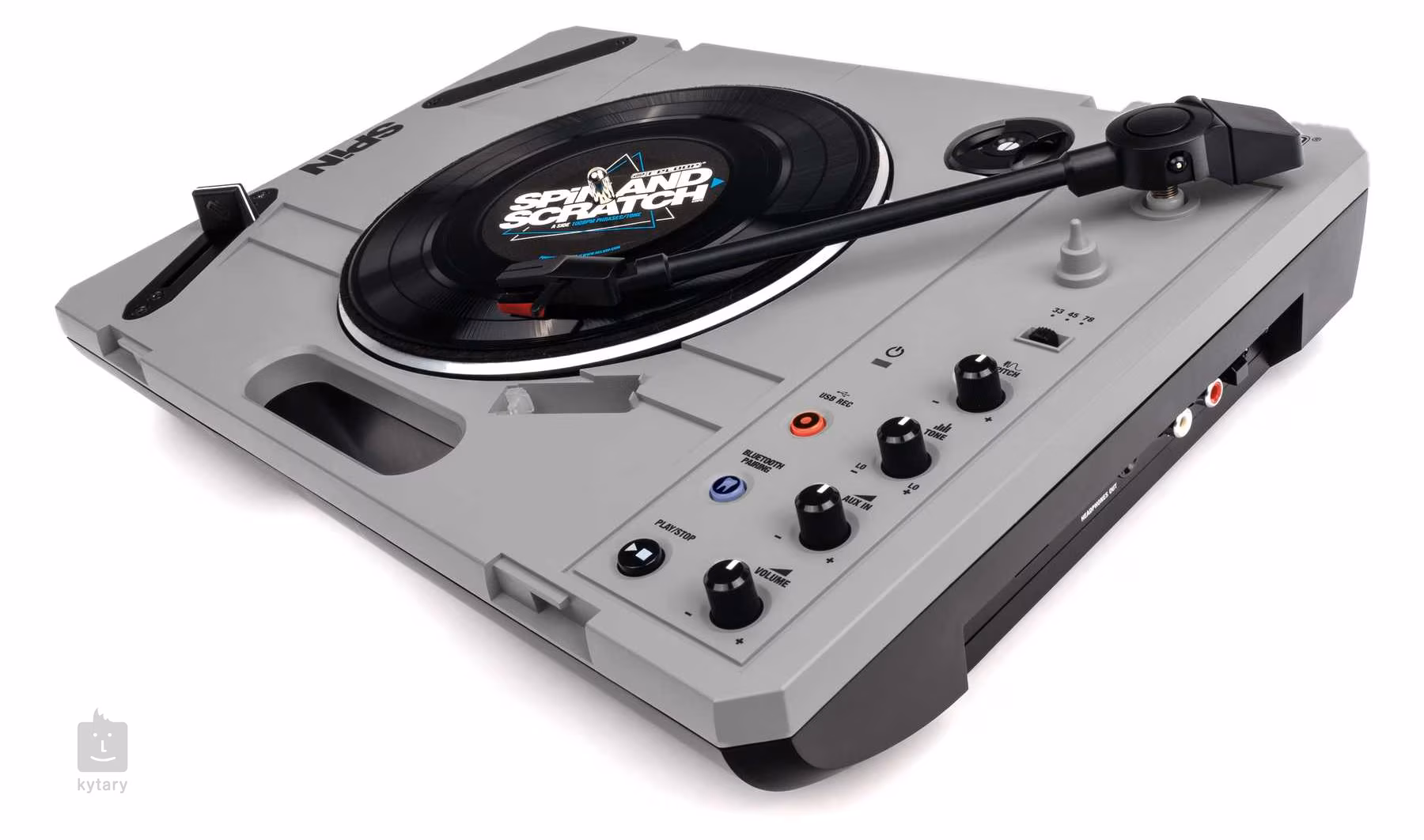 Gramofon jest wyposażony w skrzynkę transferową, siedmiocalowy winyl z próbkami zarysowań i crossfader 45 mm. Dzięki wbudowanemu głośnikowi możesz od razu wysłać swoje groove'y w świat lub użyć go do bezprzewodowego przesyłania muzyki z telefonu komórkowego lub tabletu za pośrednictwem wbudowanego odbiornika Bluetooth.