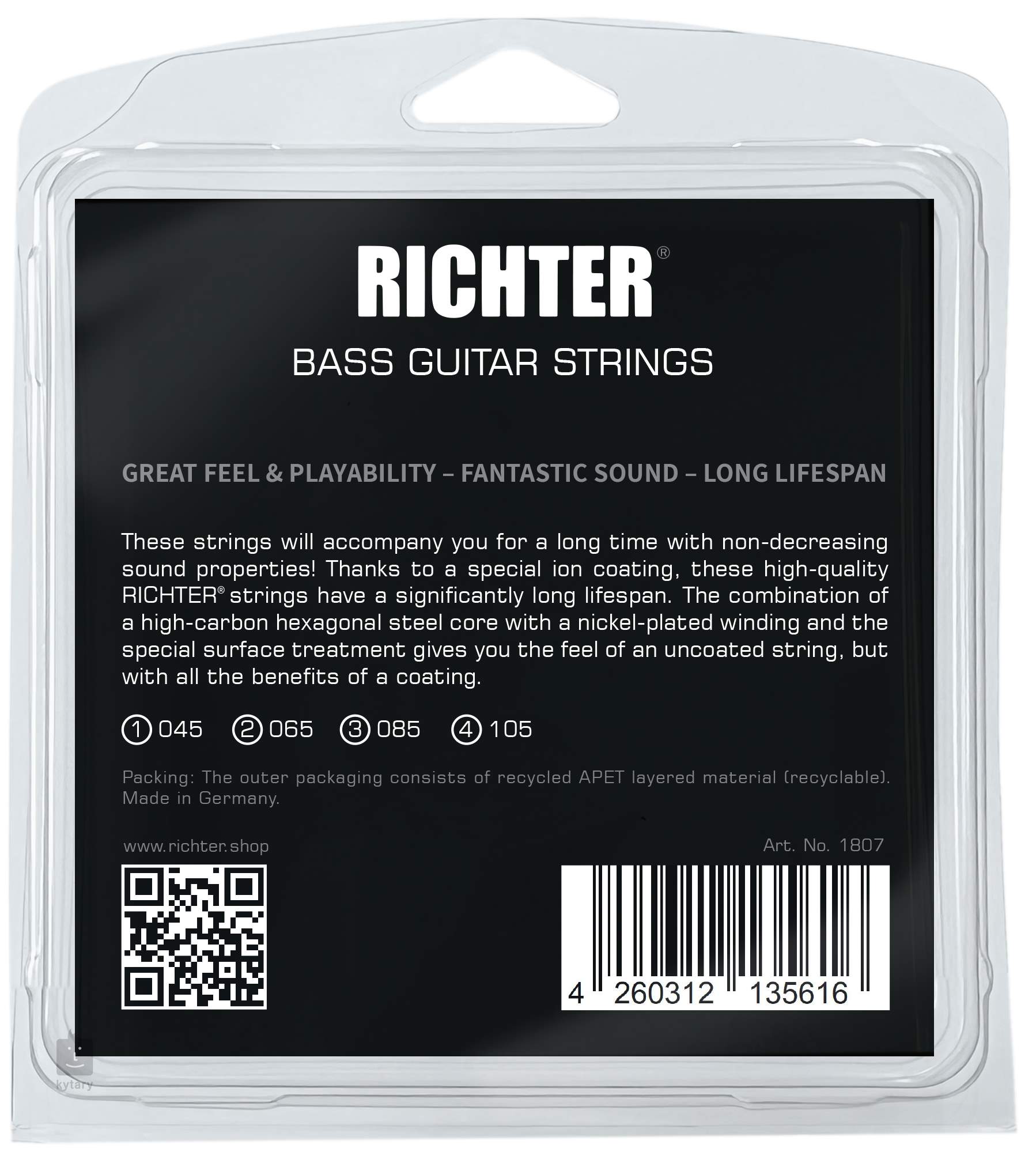 Te elektryczne struny basowe Richter zapewniają długotrwałą wytrzymałość i doskonałe brzmienie. Posiadają sześciokątny rdzeń ze stali wysokowęglowej i niklowane stalowe uzwojenia, które nadają im przyjemne, zrównoważone częstotliwościowo brzmienie odpowiednie dla różnych stylów muzycznych. Struny są pokryte specjalną powłoką jonową, która chroni je przed korozją i zabrudzeniami, znacznie wydłużając ich żywotność.