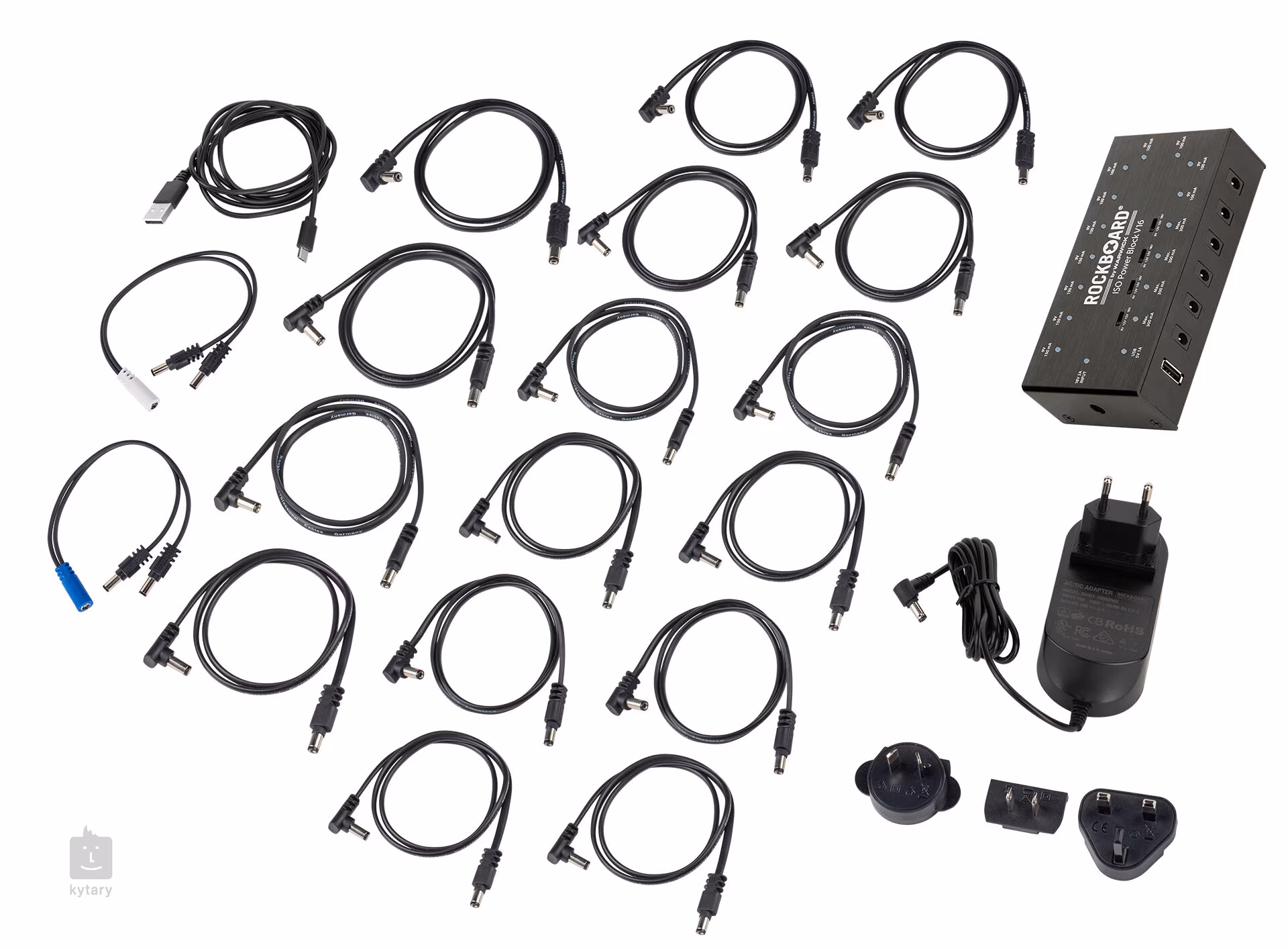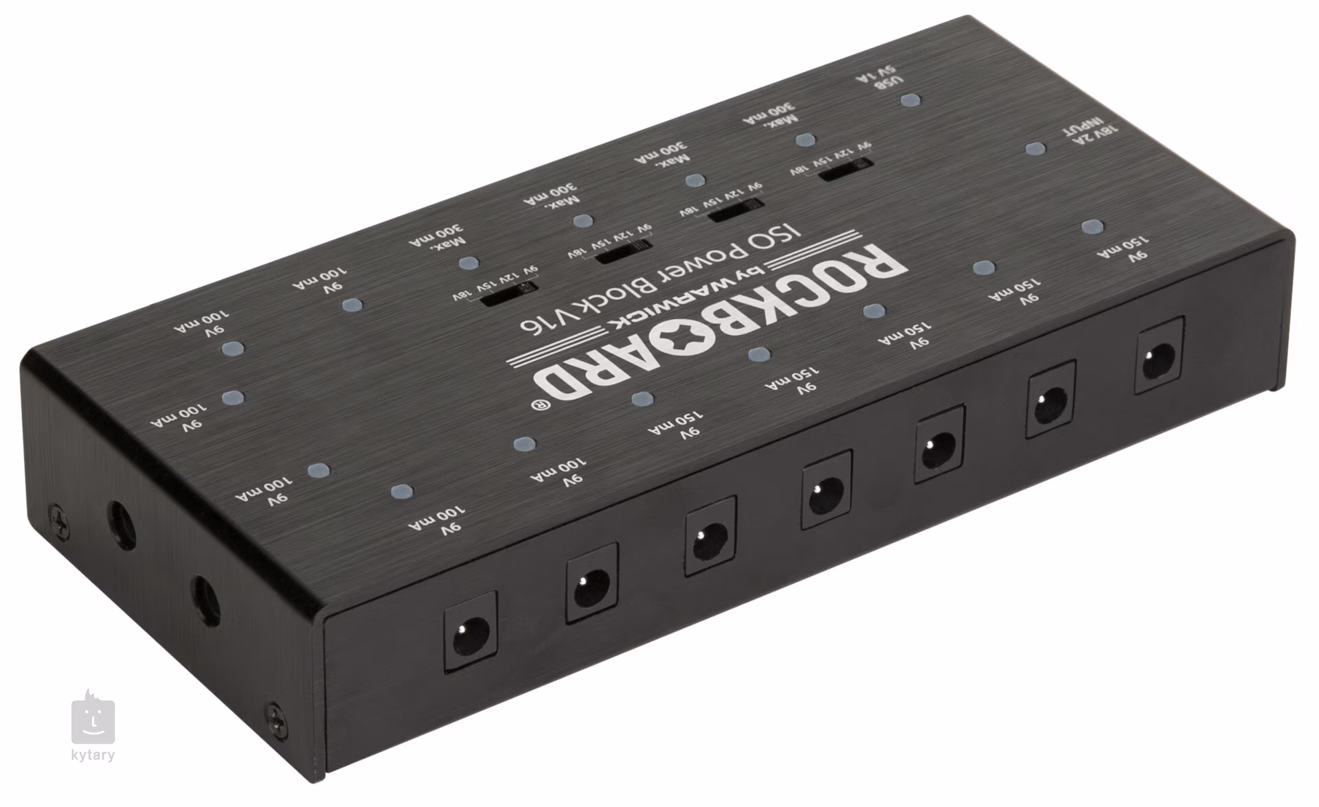 RockBoard ISO Power Block V6 to idealne rozwiązanie do zasilania dużych i złożonych pedalboardów. Wyposażony jest w jedenaście wyjść 9V DC (z maksymalnym poborem 6x 100 mA i 5x 150 mA), cztery wyjścia z przełączanym napięciem pomiędzy 9, 12, 15 i 18 V i maksymalnym poborem 300 mA oraz jedno wyjście 5V USB-A do zasilania urządzeń mobilnych. Technologia filtrowania zastosowana w każdym gnieździe zasilania zapobiega szumom przy wysokich częstotliwościach. Ważne funkcje obejmują również sygnalizację LED na każdym gnieździe zasilania i ochronę przeciwprzepięciową, która chroni podłączone efekty pedałowe przed uszkodzeniem w przypadku zwarcia.