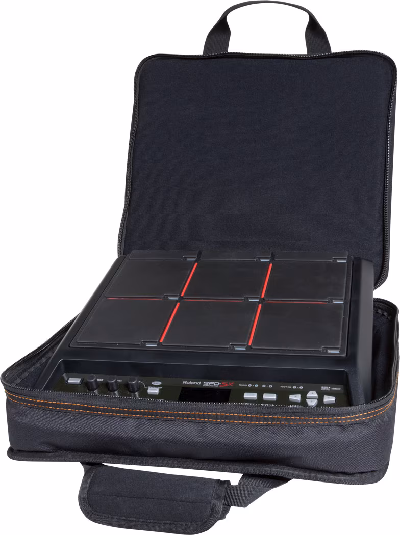 Pokrywa do Roland SPD-SX Sampling Pad. Wnętrze składa się z grubej wyściółki pokrytej polarem, natomiast zewnętrzna strona wykonana jest z wytrzymałego poliestru 600D i nylonu, który chroni nie tylko przed uszkodzeniami mechanicznymi, ale również przed niekorzystnymi warunkami atmosferycznymi. Oczywiście jest też wyściełana rączka i kieszenie na akcesoria z zamkami błyskawicznymi.