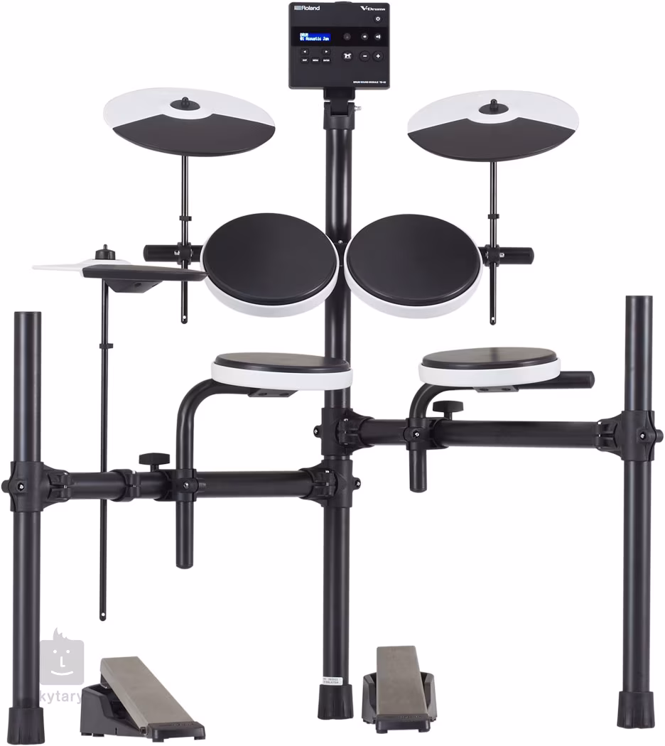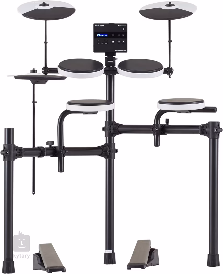 Zestaw TD-02K wyposażony jest w niezwykle czułe pady perkusyjne, w tym werbel, trzy tomy, dwa talerze crash i ride, pedał kick, pedał hi-hat oraz wysokiej jakości statyw z serii V-Drums, który ma regulowaną wysokość, dzięki czemu jest wygodny nawet dla najmniejszych perkusistów. Talerze talerzy kołyszą się naturalnie po uderzeniu i, podobnie jak talerze akustyczne, wyciszają się po chwyceniu za krawędź. Oba zapewniają różne dźwięki na korpusie i krawędzi. Pedały werbla i stopy oferują płynne przejścia między pozycjami otwartymi i zamkniętymi oraz wsparcie dla uderzeń piętą i innych specjalnych technik.